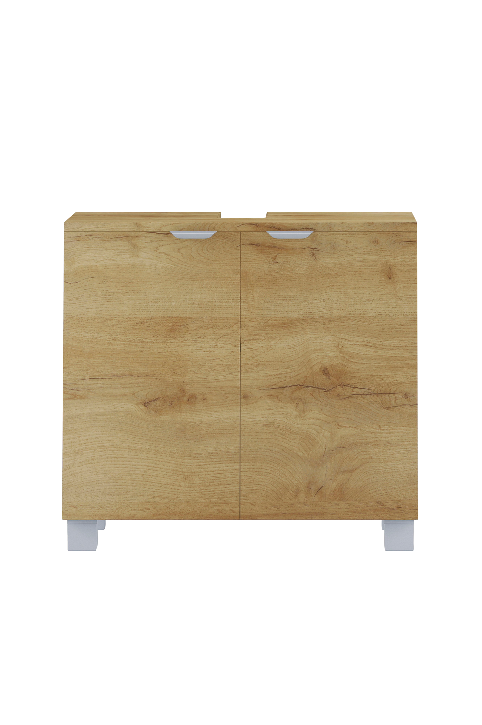 Uppgradera ditt badrum med detta eleganta och moderna handfatsskåp som är noggrant utformat för att kombinera stil och praktisk funktion. Skåpet är tillverkat av högkvalitativ spånskiva och folierad Mdf, vilket ger hållbarhet och passar perfekt i moderna interiörer. De två dörrarna ger enkel åtkomst till gott om förvaringsutrymme så att du kan hålla ordning på dina saker. En fast hylla ger struktur och möjliggör effektiv organisering. Sifonutskärningen på 20,5 x 8 cm säkerställer smidig integration av VVS-installationer. Skåpet står på stabila 5,5 cm ben och har en idealisk höjd för bekvämlighet. Skåpet är försett med eleganta silverfärgade metallhandtag och är det perfekta tillskottet till ett raffinerat och funktionellt badrum.