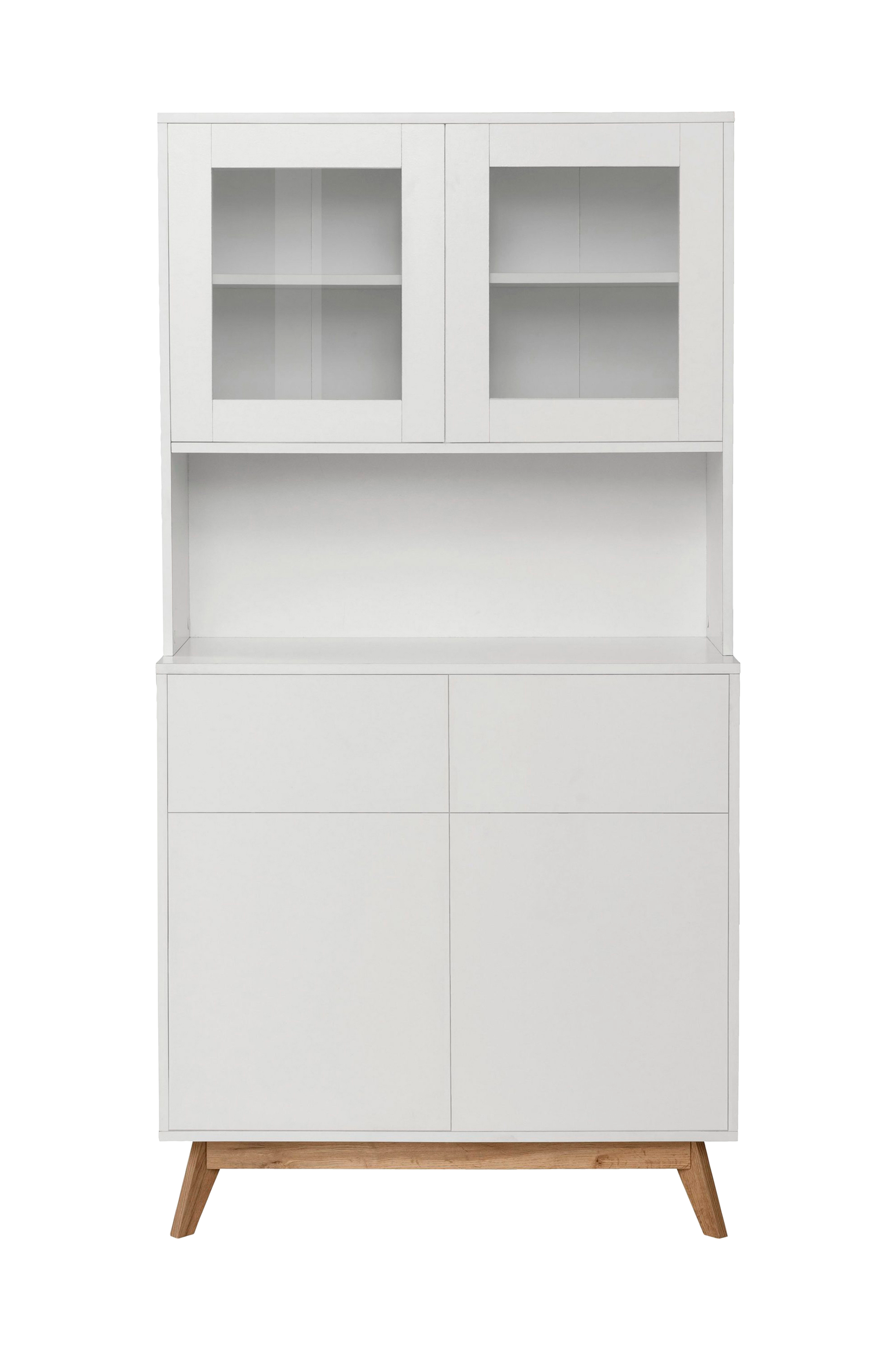 Tidlös förvaringsmöbel: bufféskåpet med push-to-open-funktion är ett elegant tillskott till din inredning. Designhöjdpunkterna är den handtagsfria designen och de lätt utsvängda möbelfötterna. Förutom utseendet övertygar vitrinskåpet med ett genomtänkt förvaringskoncept. Förutom vitrinelementen innehåller detta också flera skåpselement och lådor. Du kan därför förvara privata saker i buffén och placera dekorationer på ett attraktivt sätt.
