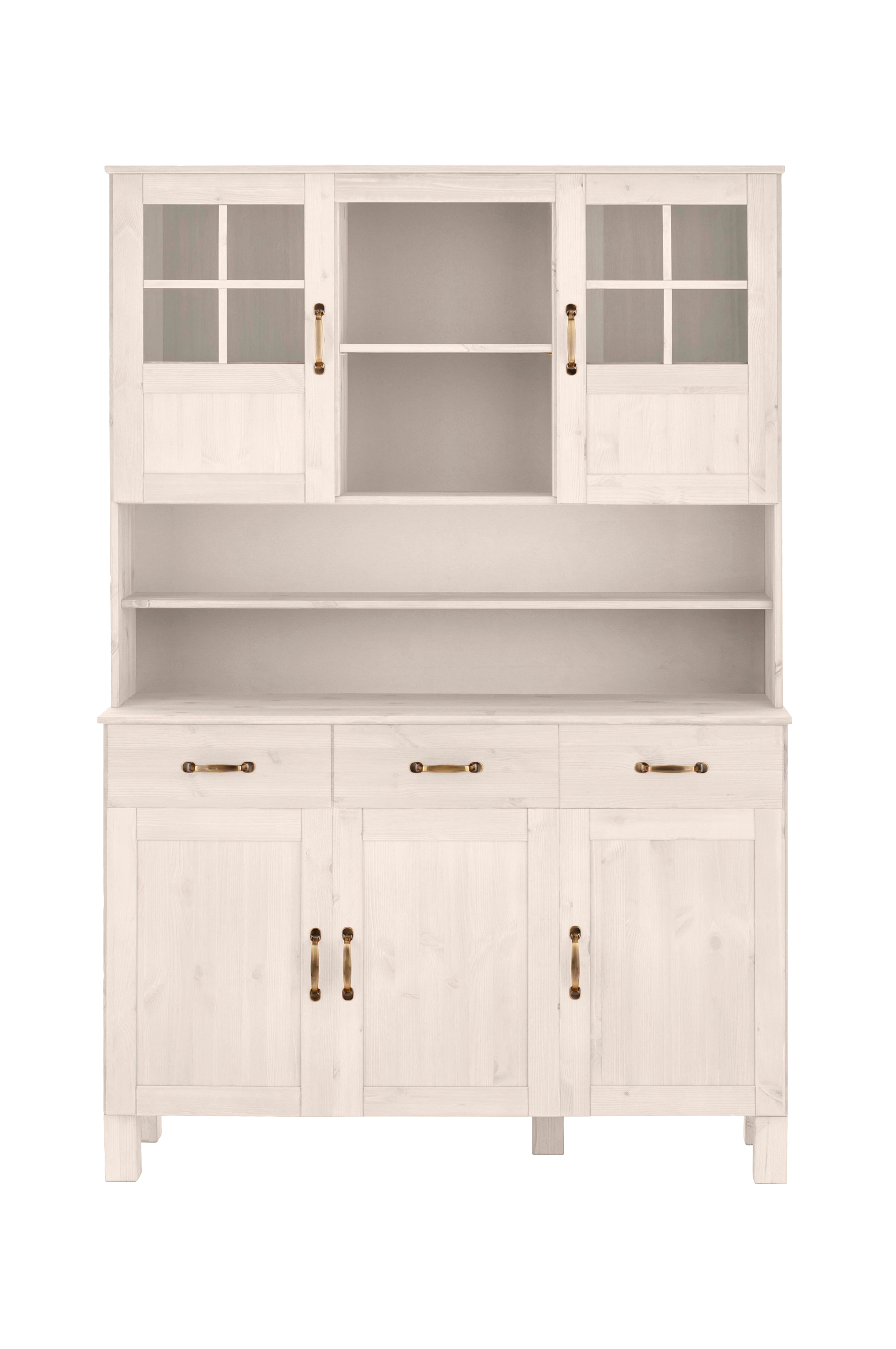 Ett speciellt blickfång för köket är det moderna bufféskåpet i rustik lantlig stil. Detta vitrinskåp med en smakfull trälook kännetecknas av sin rustika stil, som avrundas av de dekorativa handtagen. Skåpet erbjuder också gott om förvaringsutrymme för porslin, bestick och köksredskap. I de mellersta hyllorna finns plats för dekoration. Direkt nedanför är buffén utrustad med öppna fack och lådor. Förvaringsutrymmet kompletteras i det nedre området. Vitrinskåpet är tillverkat av massivt trä. Ett blickfång i ditt kök: det moderna bufféskåpet, tillgängligt i fler färgvarianter.