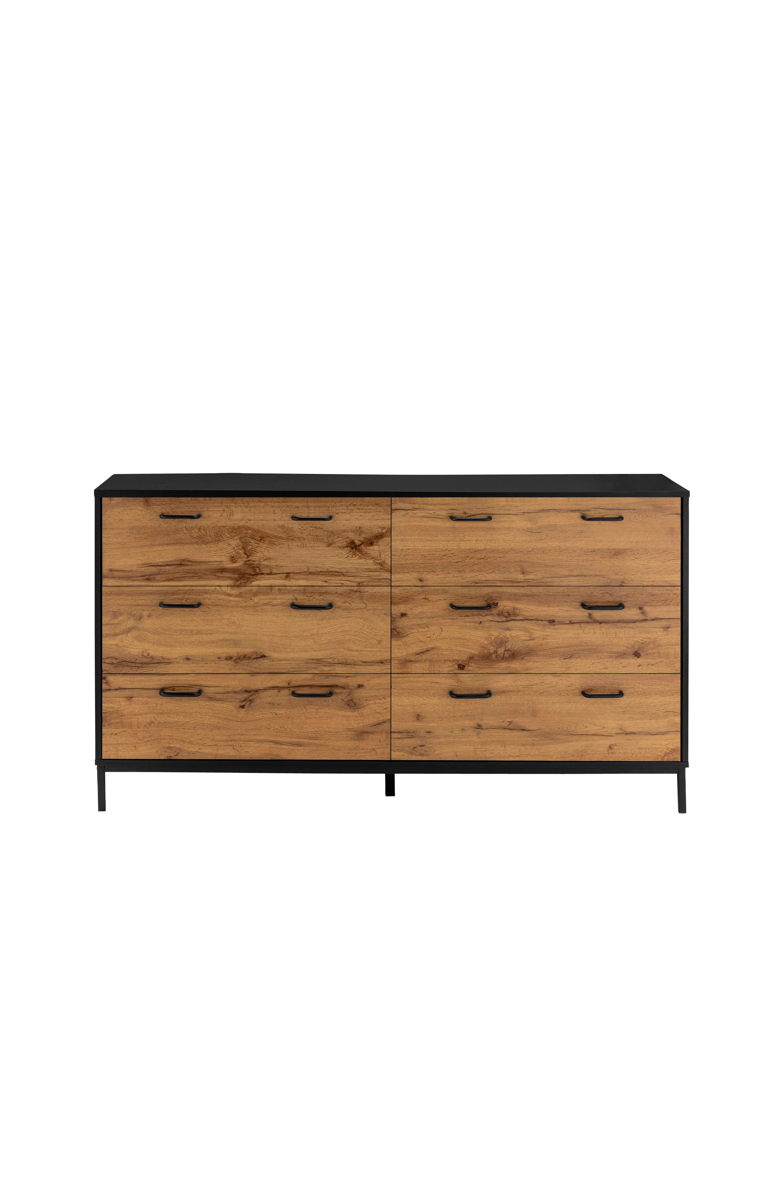 Den rymliga byrån är både en praktisk och dekorativ möbel. Kombinationen av den enfärgade stommen och fronterna i trendig trälook ger en tidlös design. De fina metallhandtagen rundar av utseendet. Olika lådor erbjuder gott om förvaringsutrymme för kläder, dokument eller sängkläder. Möbeln är tillverkad av fsc-certifierat trämaterial och har en speciell ytbeläggning, vilket gör den särskilt lätt att ta hand om. Oavsett om det är i vardagsrummet, i arbetsrummet eller i sovrummet - den rymliga byrån är en berikning för ditt hem.