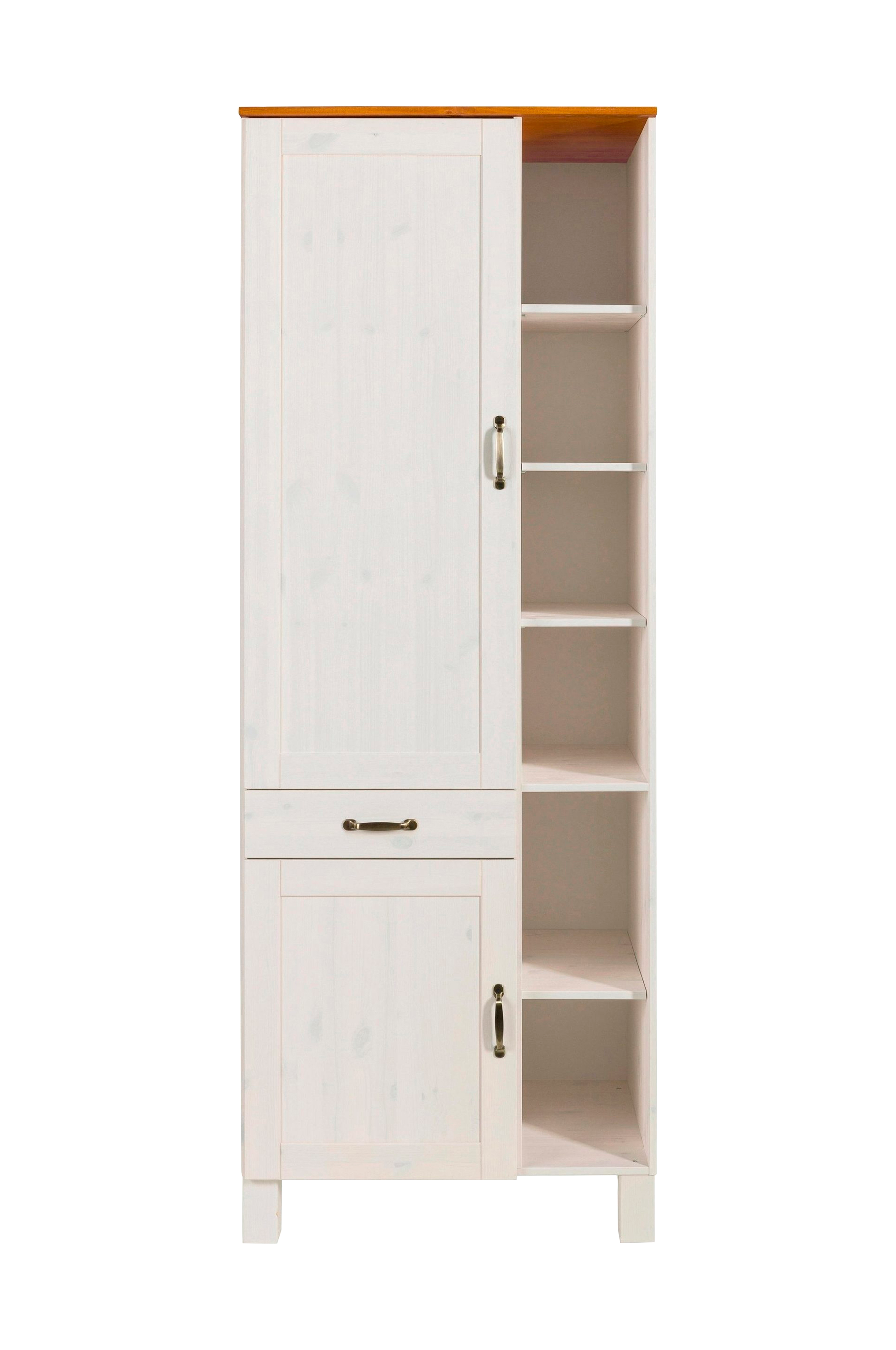 Det moderna högskåpet är tillverkat i klassisk lantlig stil och finns i olika färger. Det dekorativa köksskåpet erbjuder gott om förvaringsutrymme för olika köksredskap och är tillverkat av massiv fsc-certifierad furu. Det har dörrar, moderna metallhandtag och en låda på vänster sida, medan den högra sidan hålls öppen med flera hyllor: vackra dekorativa föremål som vaser eller glas kan presenteras öppet och lagras tydligt. Det finns också hyllor bakom dörrarna. Ett praktiskt komplement till en elegant köksinredning: högskåpet i klassisk lantlig stil.