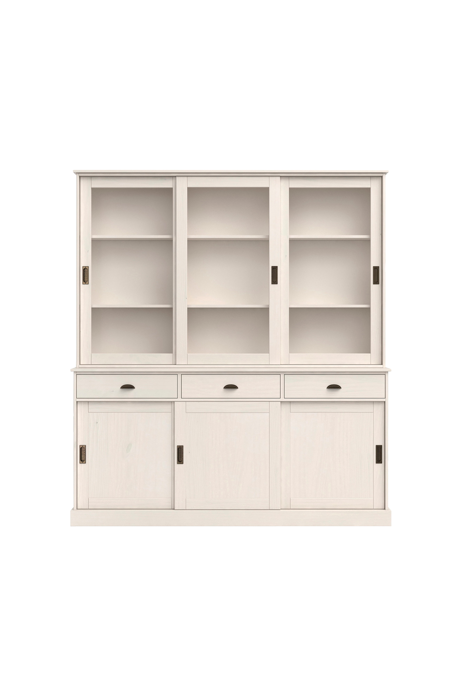 Ge ditt hem en rustik charm med detta vackert designade bufféskåp tillverkat av massiv furu för en varm och inbjudande estetik. Med en generös storlek på cirka 170 cm i bredd, 40 cm i djup och 190 cm i höjd erbjuder detta eleganta möbel gott om förvaringsutrymme samtidigt som det behåller sin lantliga stil. Det har tre skjutdörrar i glas som gör att du kan visa upp ditt fina porslin eller dekorativa föremål tillsammans med tre skjutdörrar i trä för diskret förvaring. Tre rymliga lådor och justerbara hyllor ger flexibla förvaringsmöjligheter som passar dina behov. Detta bufféskåp, som accentueras av robusta metallhandtag, kombinerar hållbarhet med klassisk elegans, vilket gör det till ett perfekt tillskott till alla mat- eller vardagsrum. Oavsett om det används för förvaring av nödvändiga saker eller för att visa upp värdefulla föremål, ger det ditt hem tidlös skönhet och praktisk funktionalitet.