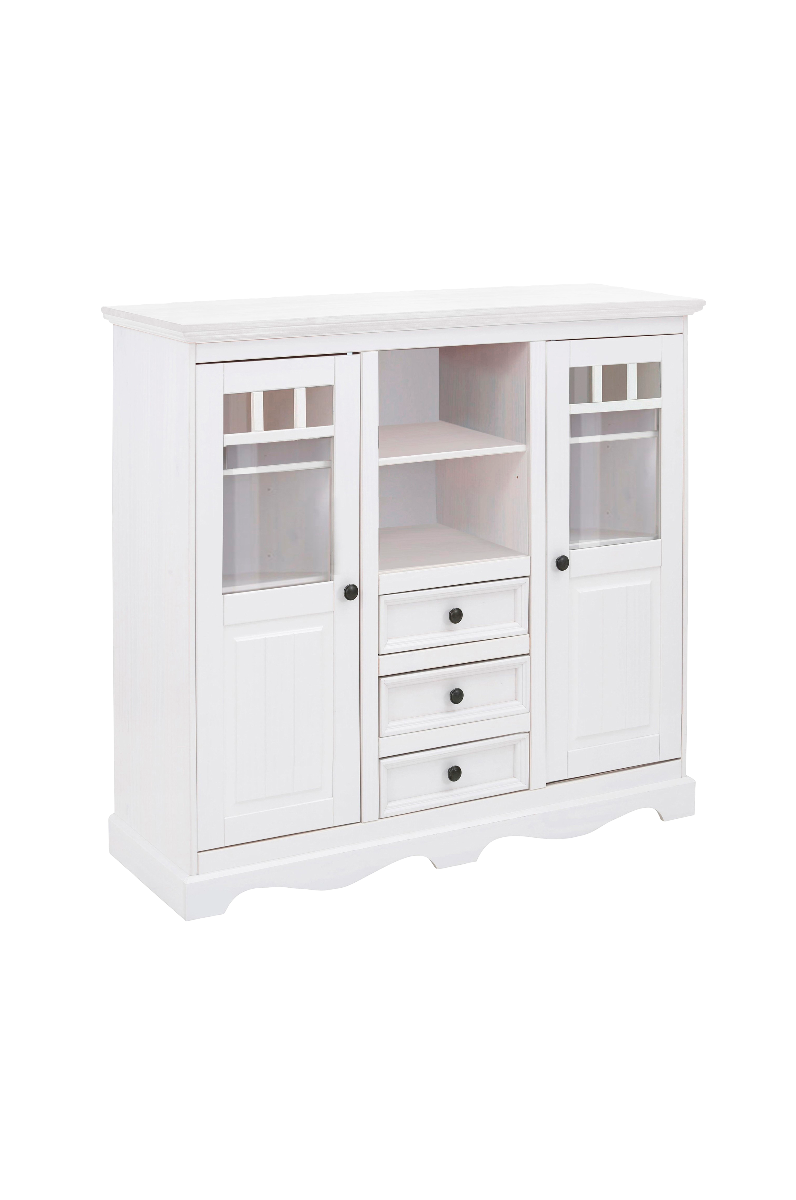 Skänken i klassisk lantlig stil är ett riktigt förvaringsunder. Den vackra designen imponerar med sina böjda detaljer och dekorativa fräsningar. Tillverkad av fsc?-certifierat massivt trä och med ett träutseende som också understryker byråns hemtrevliga charm. Handtagen i metall kompletterar det attraktiva helhetsintrycket. Vackra vaser eller favoritföremål kan ställas fram bakom dörrarna med glasinsatser. Sidofacken är perfekta för förvaring av porslin eller hemtextilier. Småsaker som alltid ska vara inom räckhåll hittar sin plats i lådorna.