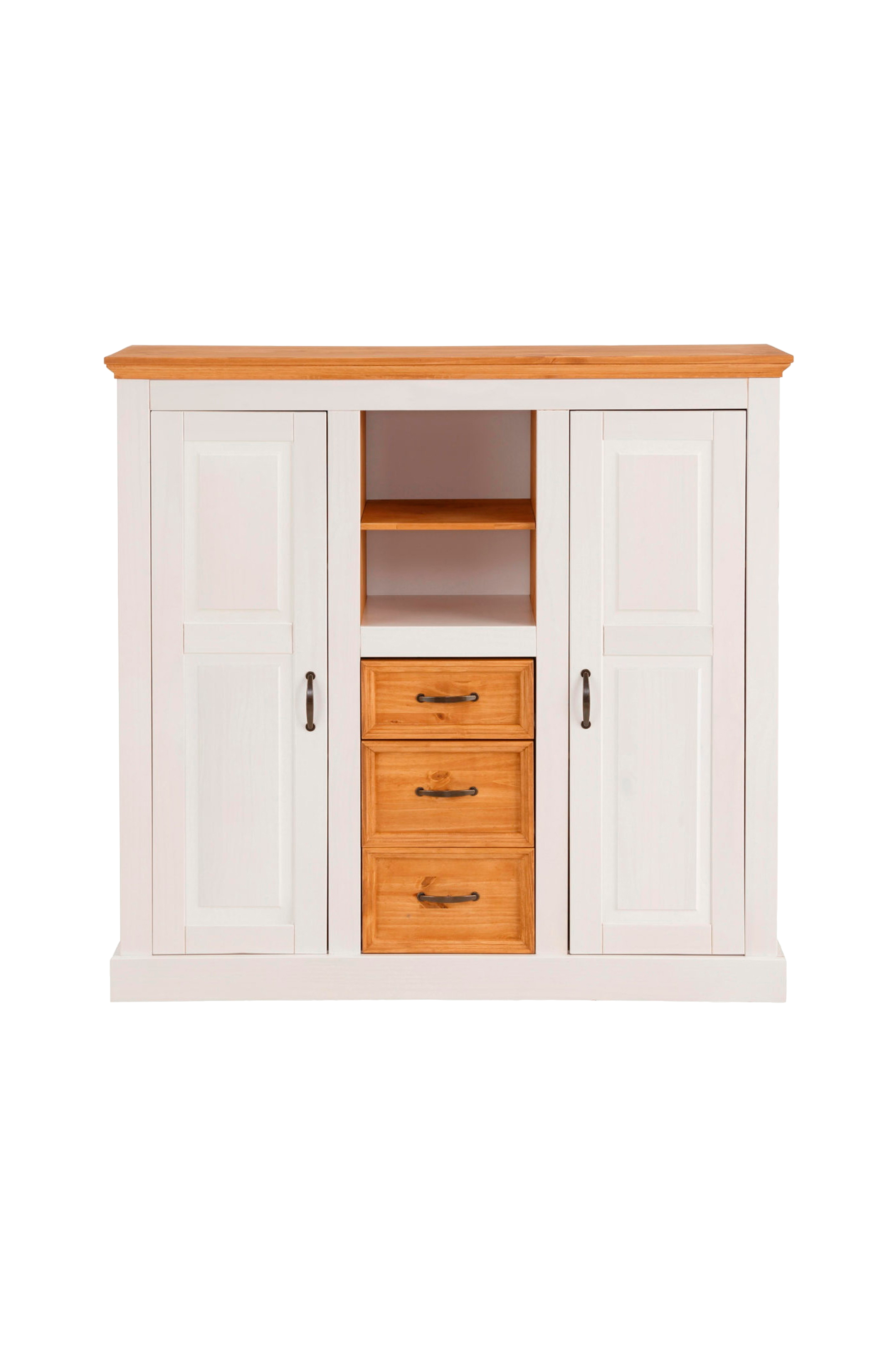 Den eleganta highboarden hamnar snabbt i centrum med sin attraktiva design. Skåpet av fsc-certifierat massivt trä finns i olika färgade utföranden med synlig trästruktur och motsvarar därmed den moderna lanthusstilen. Dörrar och lådor har metallhandtag. Vitrinskåpet kan placeras i vardagsrummet eller matsalen, men gör sig också bra i sovrummet. Området bakom dörrarna är särskilt praktiskt. Här finns flera trähyllor som erbjuder plats för många saker. I lådorna, som löper på metallskenor, kan många småsaker förvaras.