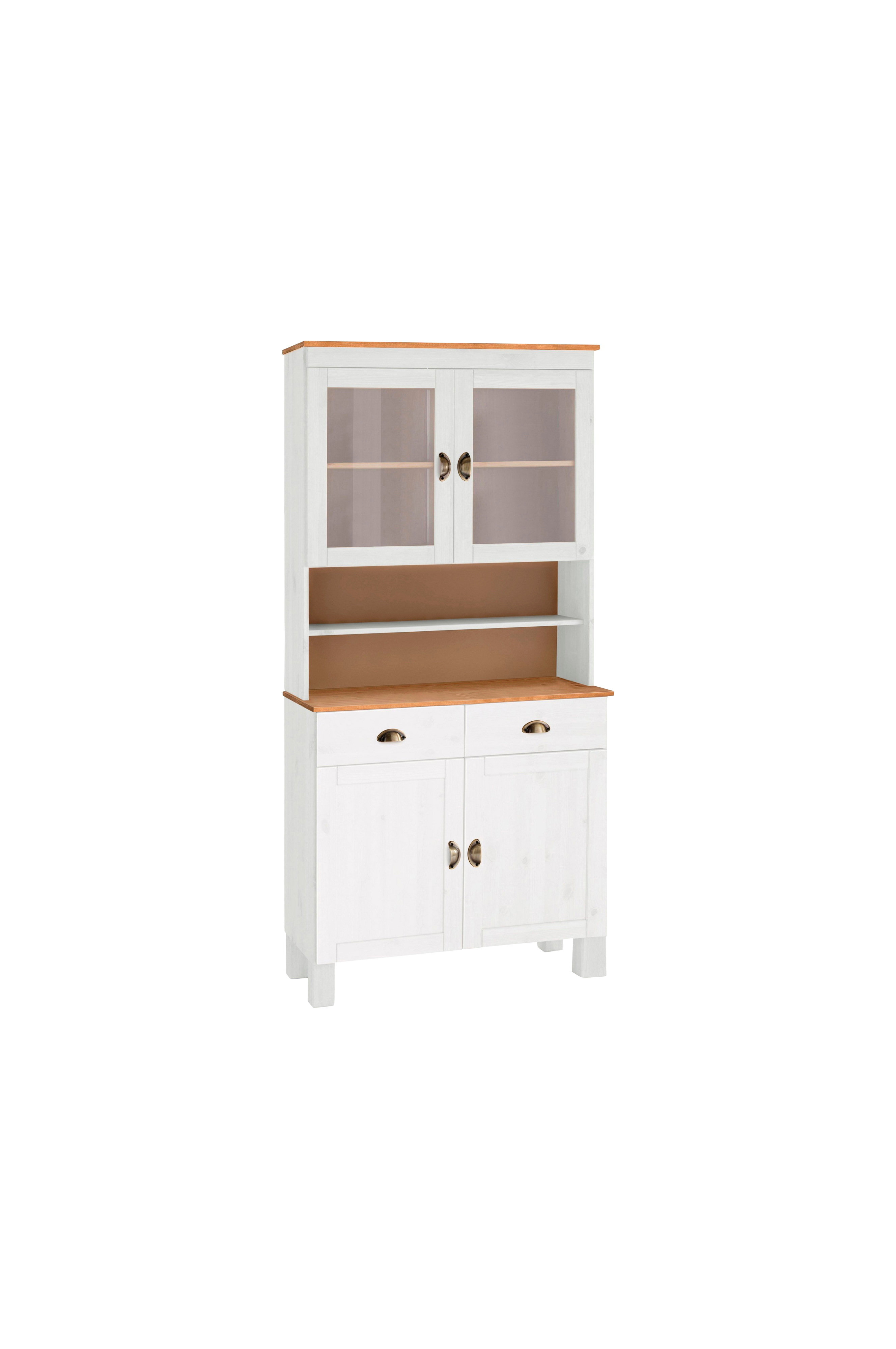 Med denna köksbuffé i modern lantlig stil kan du sätta en levande accent. Utseendet kännetecknas av de synliga ådringarna i det massiva trä som används. I den övre delen av bufféskåpet är dörrarna utrustade med gasinsatser. Designen avrundas med eleganta handtag. Stora och små köksredskap kan förvaras bakom skåpsdörrarna och i lådorna. Favoritföremål kan förvaras i de öppna facken eller i vitrinelementet. Fsc-certifierat massivt trä används för produktion.