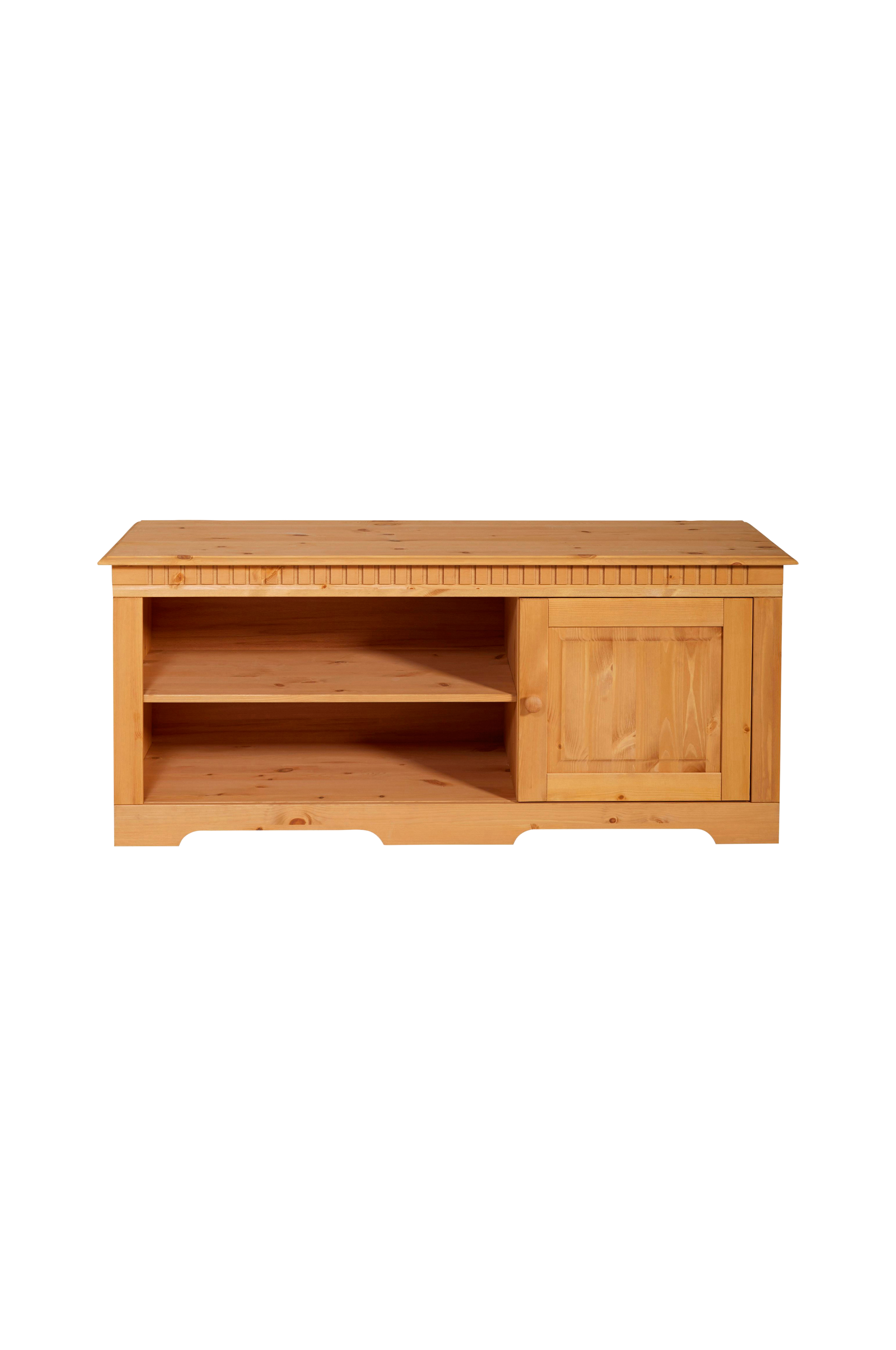 Skänk i massivt trä. Denna lowboard i massivt trä har ett vackert utseende och lång livslängd. Dina media- eller ljudsystem är i goda händer eftersom den har en kabelöppning på baksidan. Du kan bestämma öppningsriktningen som du vill eftersom dörrgångjärnet kan fästas till höger eller vänster. Handtagen är stabila och slits därför inte ut lika snabbt. Den maximala lastkapaciteten är en vikt på 50 kg. Produkten är tillverkad i Europa.