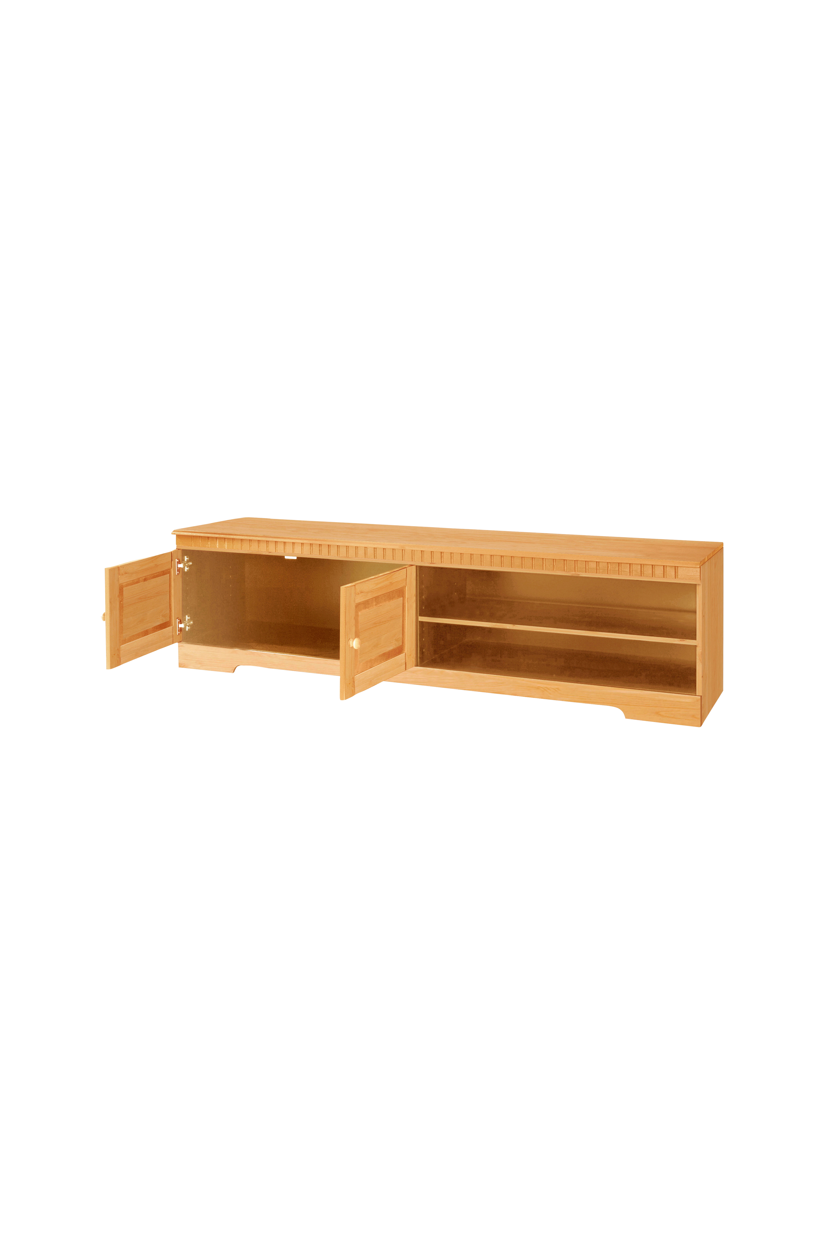 Tillverkad av massivt trä ger denna lowboard en naturlig atmosfär i ditt hem och kommer att ge dig glädje under lång tid. Dörrstoppet kan monteras flexibelt så att dörrarna kan monteras till höger eller vänster.
