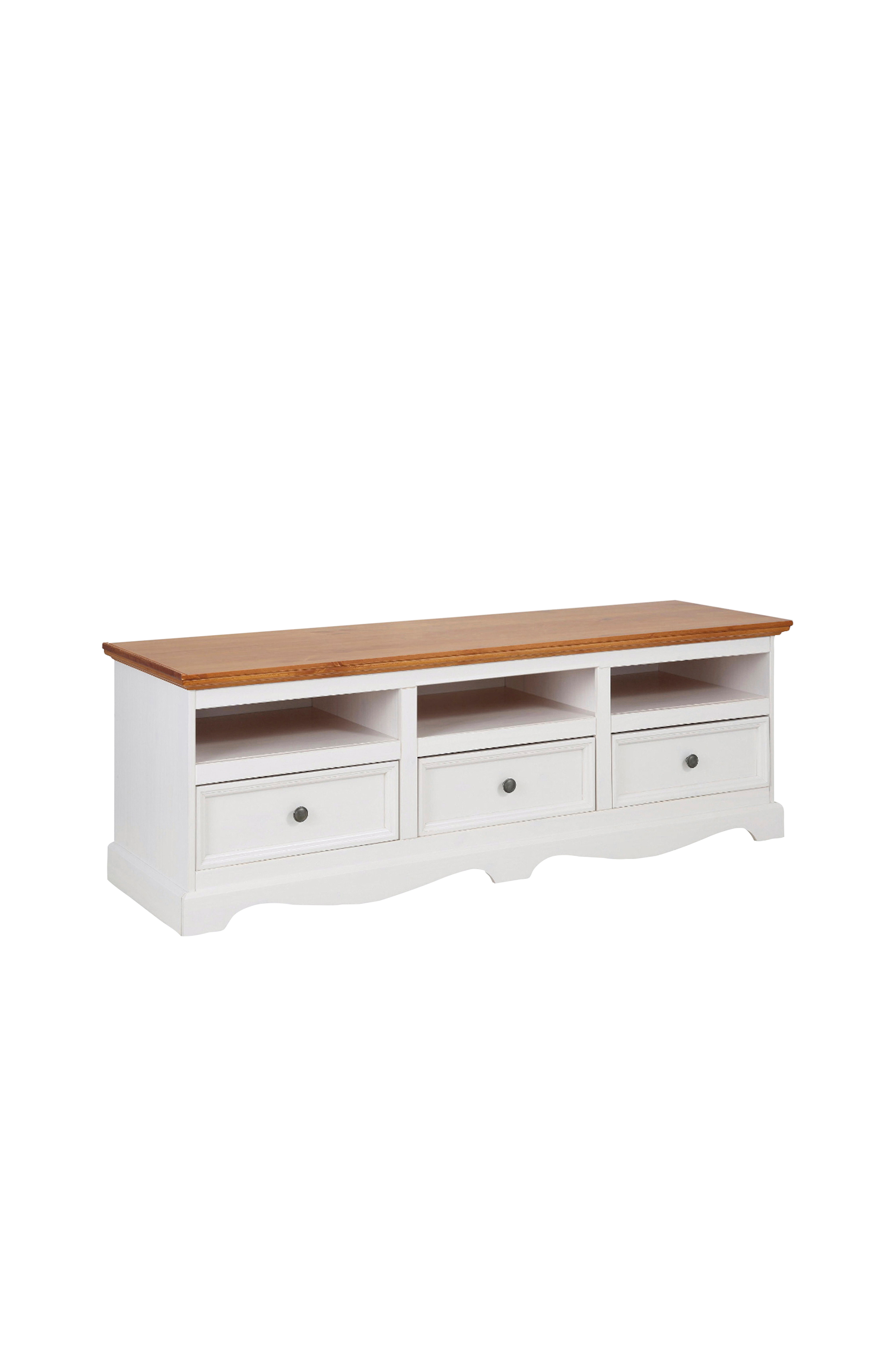 Lowboard i lantlig stil är det perfekta komplementet för en mysig inredning. Den är tillverkad av fsc-certifierat massivt trä och imponerar med sitt vackra träutseende. De svängda linjerna och de vackra fräsningarna gör sideboardet till en möbel med karaktär. Handtagen i metall fulländar det lyckade helhetsintrycket. Tv-tillbehör kan bekvämt förvaras i lådorna. De öppna facken är idealiska för receiver, spelkonsoler och dvd-spelare.