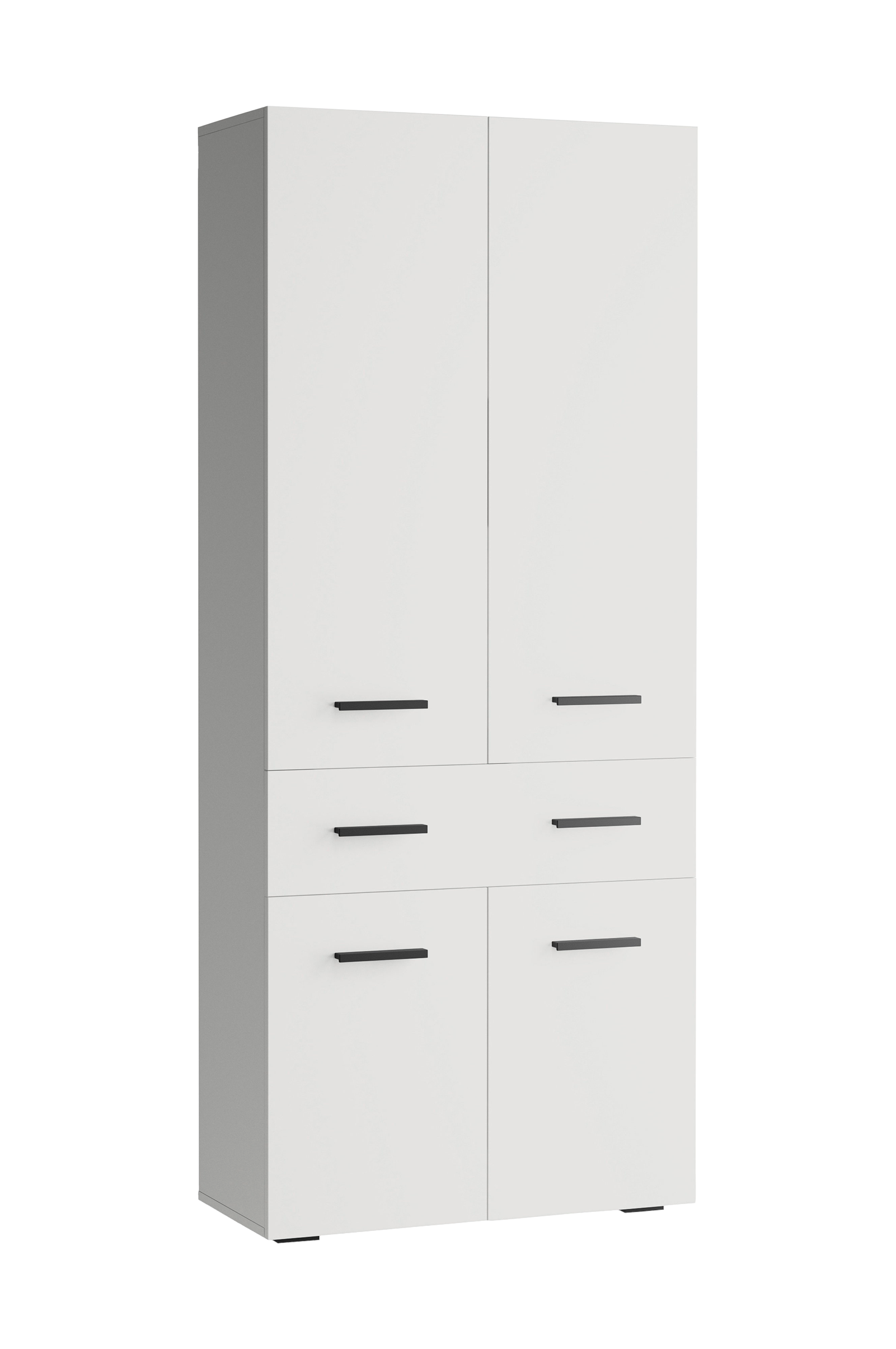 Denna höga skåp är en utmärkt förvaringslösning för alla utrymmen. Den har fyra dörrar och en låda som ger gott om plats för att organisera föremål. Skåpet står på stabila plastben med en höjd på 2 cm som garanterar stabilitet. Handtagen i metall ger det ett modernt och elegant utseende.