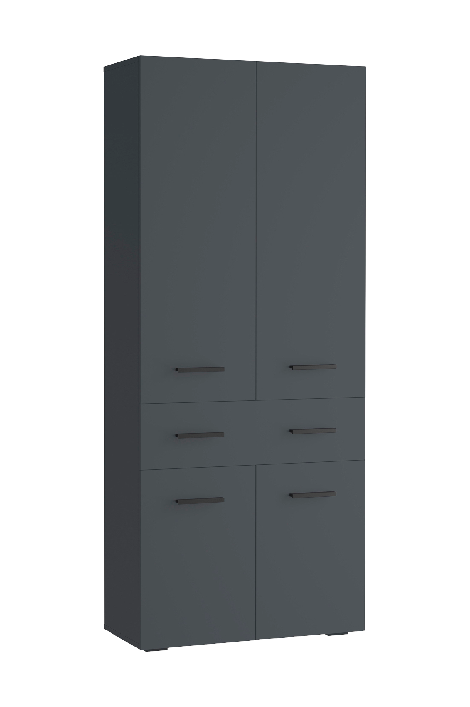 Denna höga skåp är en utmärkt förvaringslösning för alla utrymmen. Den har fyra dörrar och en låda som ger gott om plats för att organisera föremål. Skåpet står på stabila plastben med en höjd på 2 cm som garanterar stabilitet. Handtagen i metall ger det ett modernt och elegant utseende.