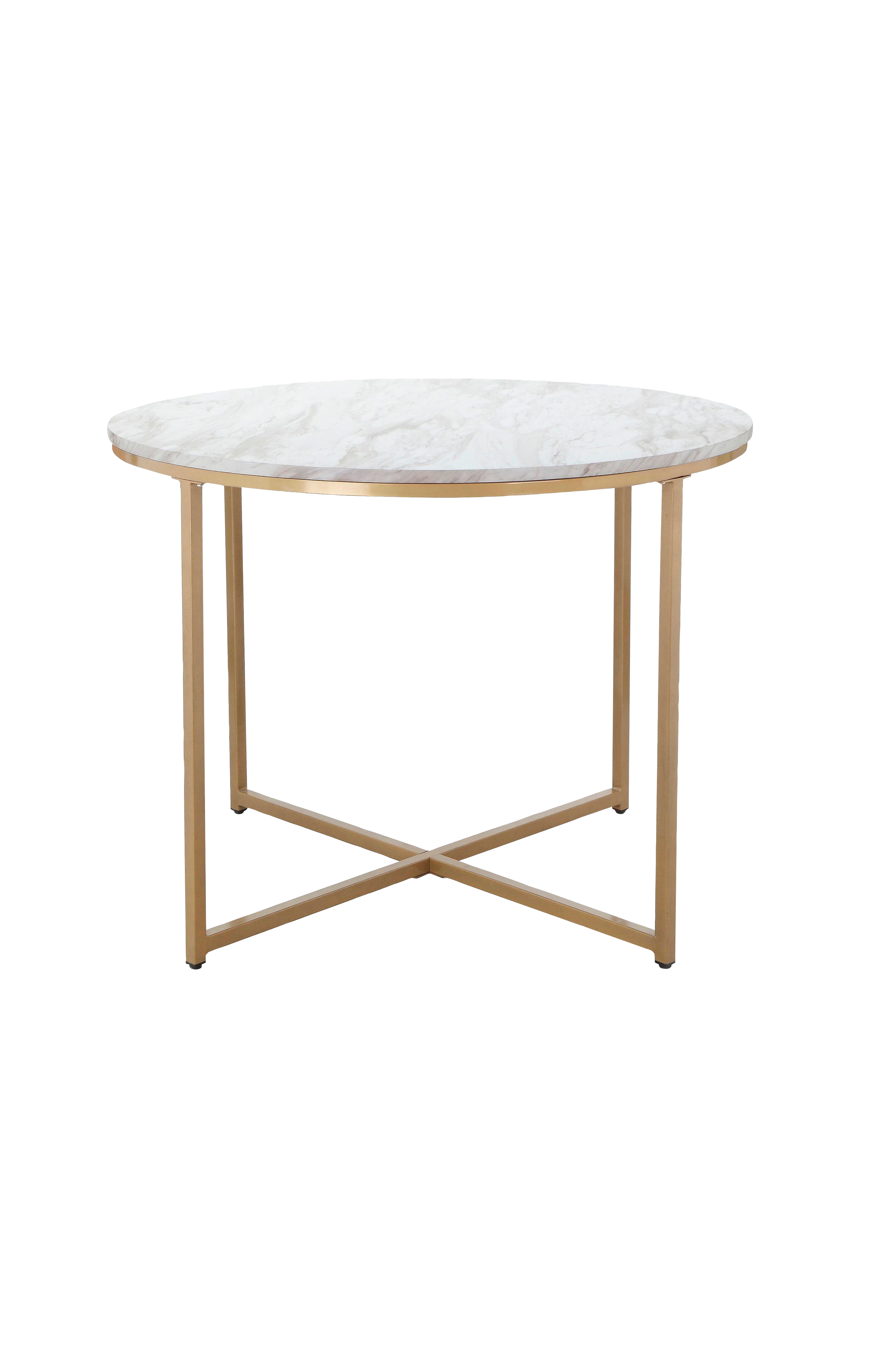 En touch av lyx för ditt hem: det är vad det runda matbordet erbjuder dig i en extravagant design. Tack vare den sofistikerade kombinationen av material och dekor är detta bord ett riktigt blickfång i din matsal. En rund bordsskiva i marmorlook vilar på den guldfärgade 4-benade metallramen. Du kan samla dina nära och kära runt detta bord för att äta middag tillsammans och tillbringa kvalitetstid tillsammans. Ytan är lätt att rengöra och är tillverkad av ett fsc-certifierat trämaterial. Finns i två storlekar.