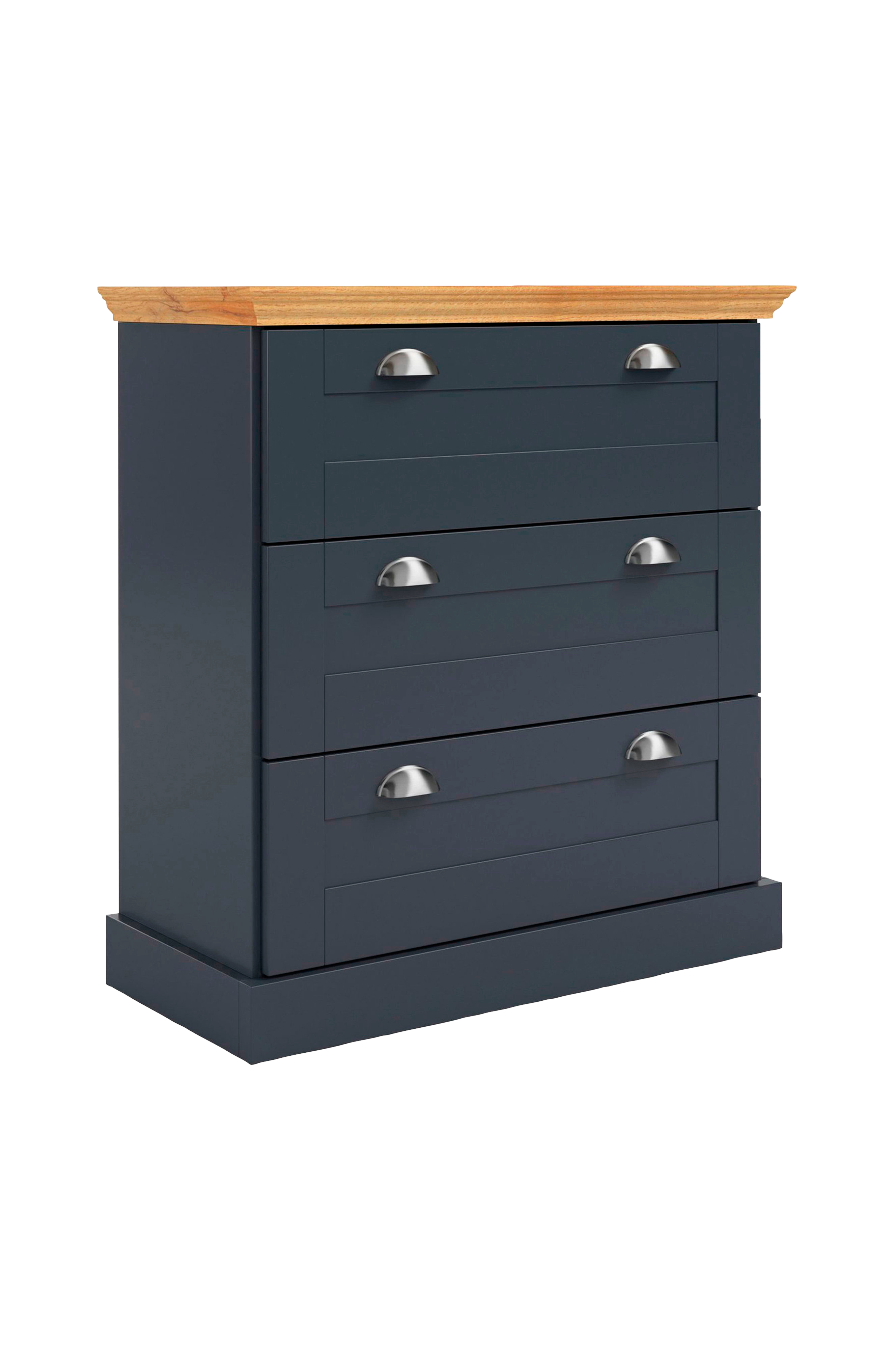 Denna byrå är tillverkad av spånskivor och Mdf, vilket garanterar hållbarhet och stabilitet. Den har en maximal belastningskapacitet på 60 kg. De monterade måtten är cirka 75 cm bred, 35 cm djup och 80 cm hög. Den har metallhandtag och tre lådor som erbjuder gott om förvaringsutrymme. Perfekt för sovrummet, hallen eller vardagsrummet.