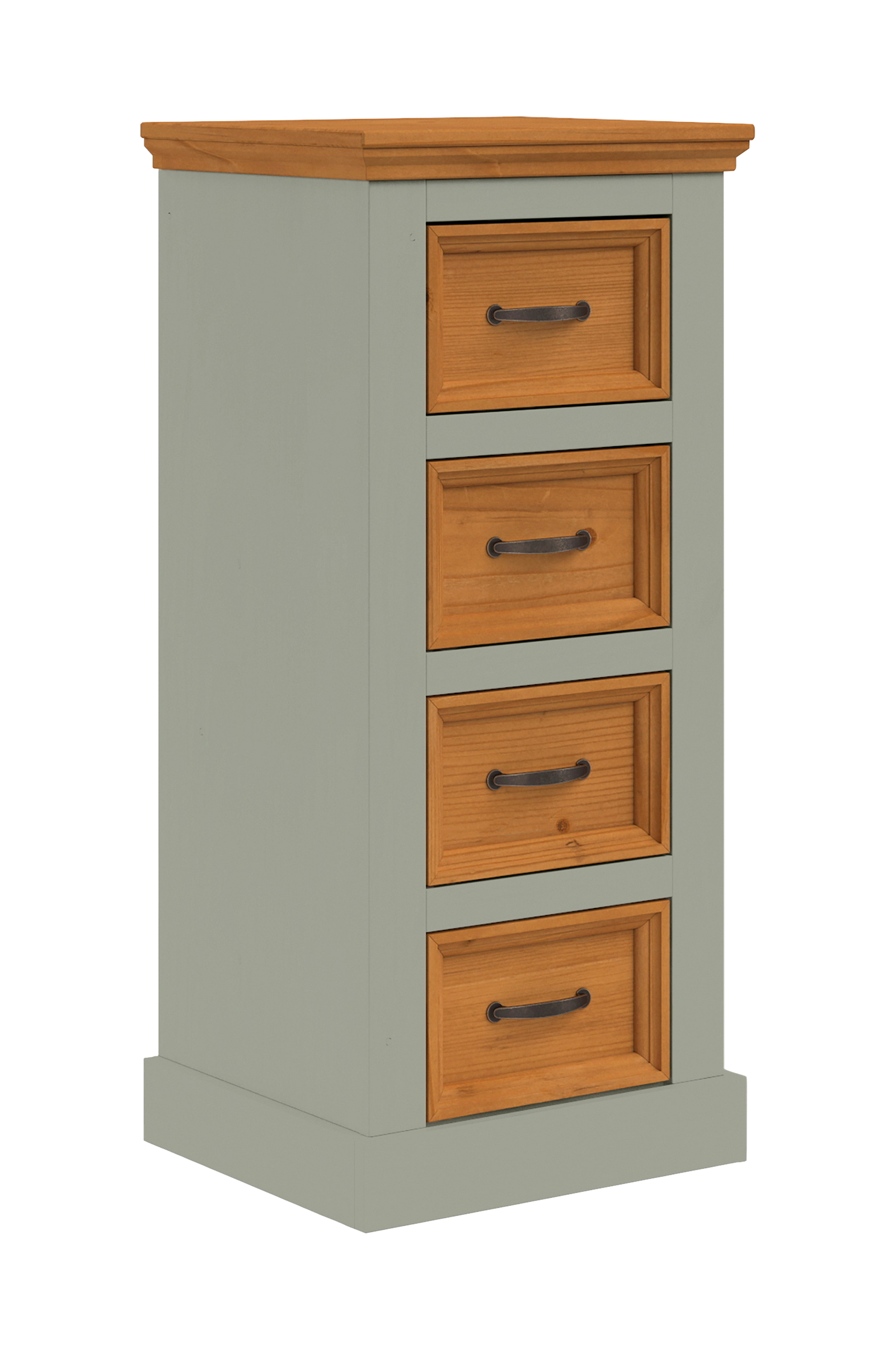 Denna byrå i massiv furu har fyra rymliga lådor och metallhandtag. Den robusta konstruktionen och den naturliga träfinishen ger ett rustikt charm till vilket rum som helst. Metallhandtagen skapar en stilfull kontrast som förstärker den klassiska designen. Denna byrå är perfekt för att organisera kläder, sängkläder eller andra nödvändigheter och kombinerar funktionalitet med bra material, vilket gör den till ett praktiskt och hållbart val för ditt hem.