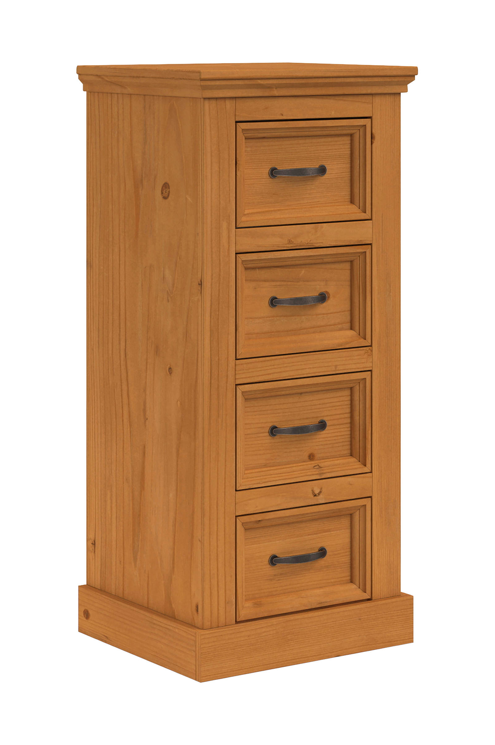 Denna byrå i massiv furu har fyra rymliga lådor och metallhandtag. Den robusta konstruktionen och den naturliga träfinishen ger ett rustikt charm till vilket rum som helst. Metallhandtagen skapar en stilfull kontrast som förstärker den klassiska designen. Denna byrå är perfekt för att organisera kläder, sängkläder eller andra nödvändigheter och kombinerar funktionalitet med bra material, vilket gör den till ett praktiskt och hållbart val för ditt hem.