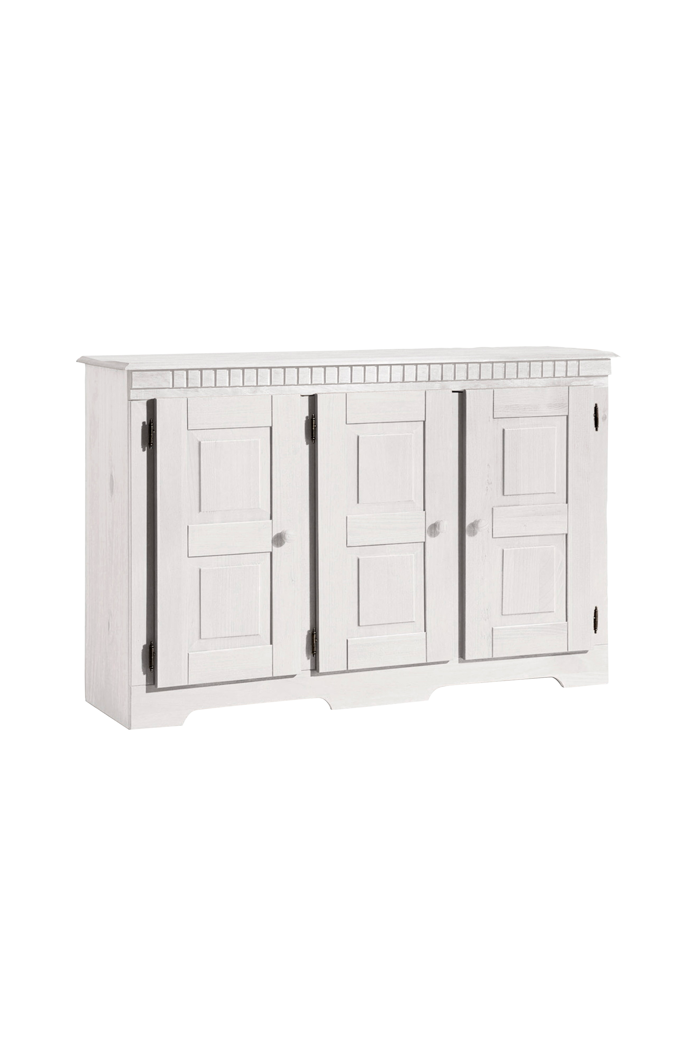 Trädesign med många detaljer - sideboardet imponerar med sina många små specialfunktioner och det framgångsrika utförandet. Det fsc-certifierade furuträet i kombination med den individuella ådringen understryker det solida intrycket av sideboardet. Tillplattade kanter, eleganta gångjärn, runda dörrhandtag och olika dekorativa element på och i träet kompletterar sideboardets charm. Bakom trädörrarna finns justerbara hyllor som ger ordning och gott om justerbart förvaringsutrymme. Oavsett om det är i hallen, sovrummet, matsalen eller vardagsrummet, ger denna skänk varje rum sin speciella touch.