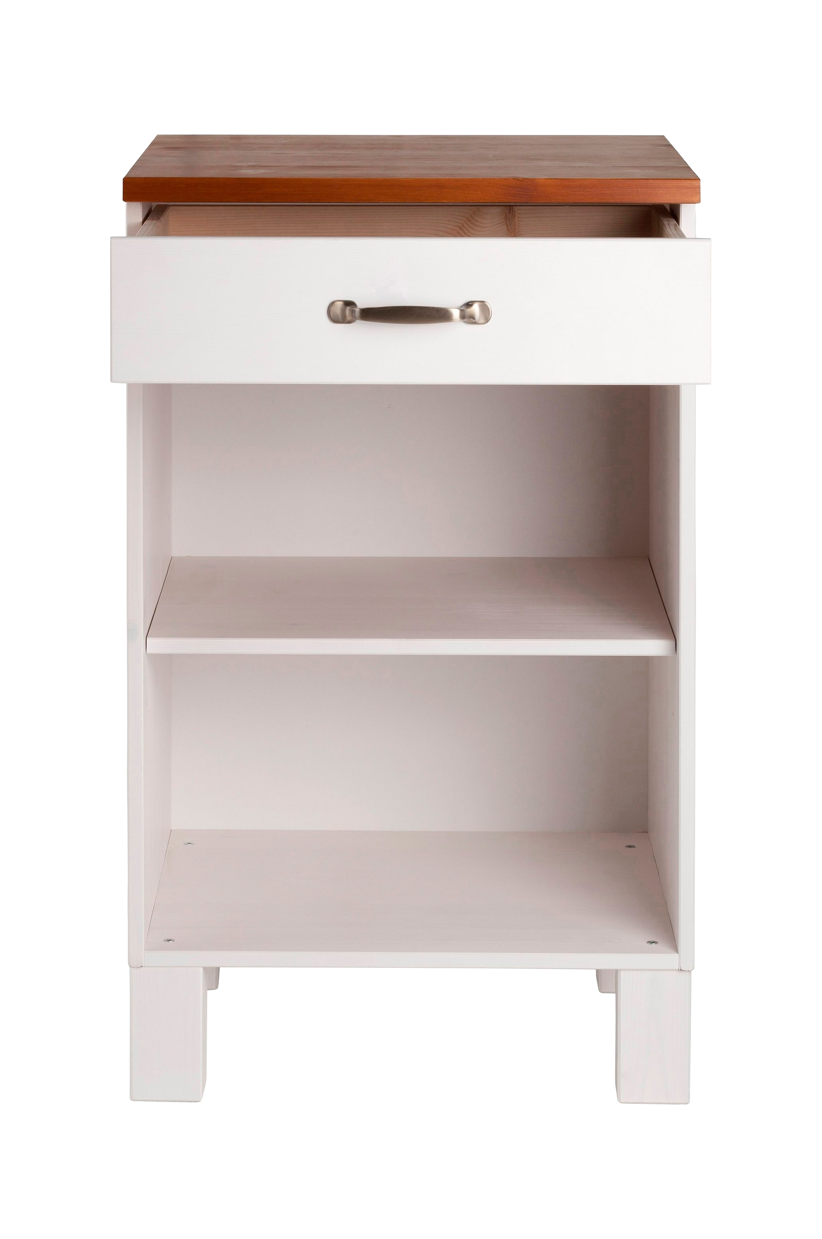 Ta med den mysiga lantliga stilen in i din hemmiljö med detta underskåp. Köksskåpet av fsc-certifierad massiv furu imponerar med sin vackra design i en modern, enkel variant av lantlig look. De tydliga linjerna och det subtila metallhandtaget understryker detta intryck. Facken erbjuder gott om förvaringsutrymme, medan lådan erbjuder plats för bestick eller småsaker. Skåpet finns i olika färgkombinationer och kan enkelt integreras i befintlig köksinredning. Upptäck fler produkter från denna köksserie.