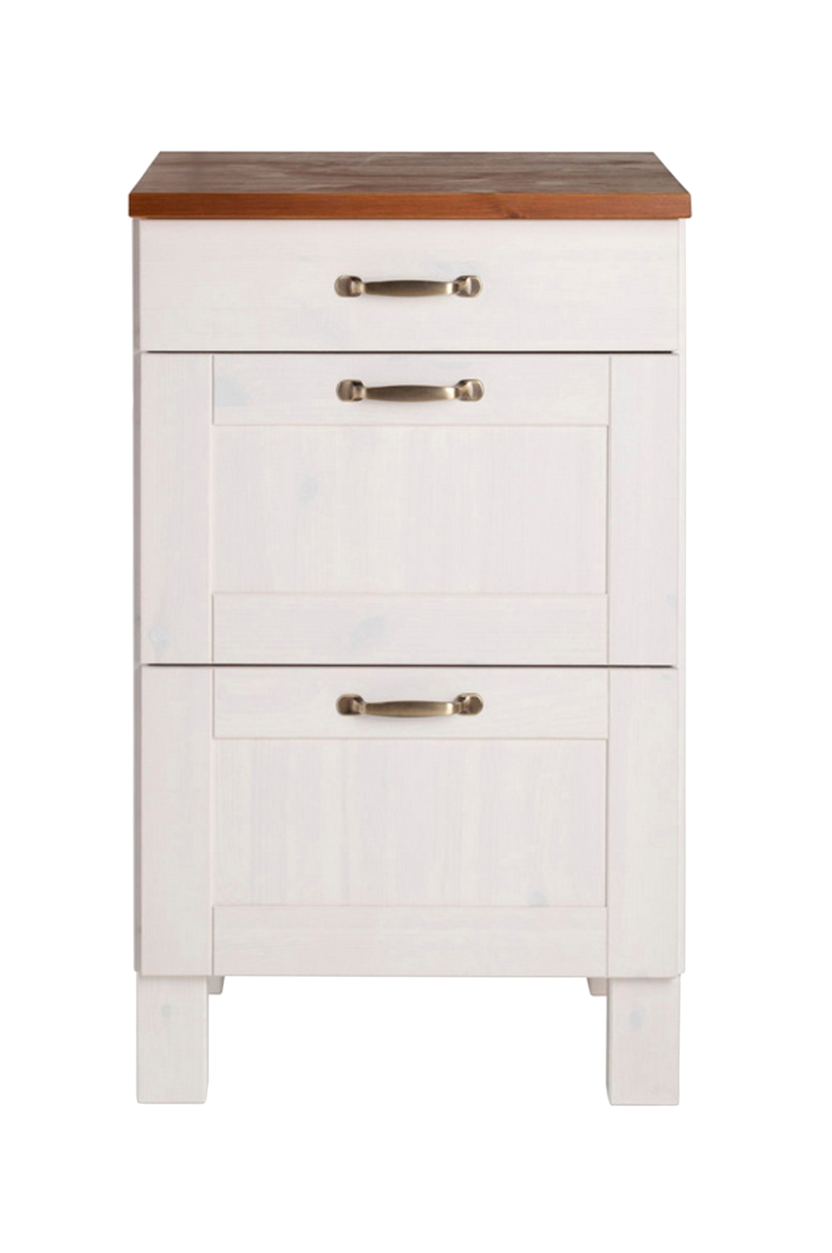 Modernt lantkök med högkvalitativt utförande: köksenheten imponerar med sitt attraktiva utseende och praktiska förvaringsutrymme. Den övre lådan är perfekt för bestick och andra köksredskap, medan de två rymligare lådorna kan rymma till exempel porslin eller mat. Skåpet och bänkskivan är tillverkade av fsc-certifierad, massiv furu och finns i olika, framgångsrika färgkombinationer. De värdefulla metallhandtagen avrundar den attraktiva designen på detta underskåp. Möblerna i denna köksserie kan kombineras individuellt, men förlorar inte sin dekorativa effekt även som en enda möbel. Underskåpet ger en mysig lantlig känsla och sätter hemtrevliga accenter.