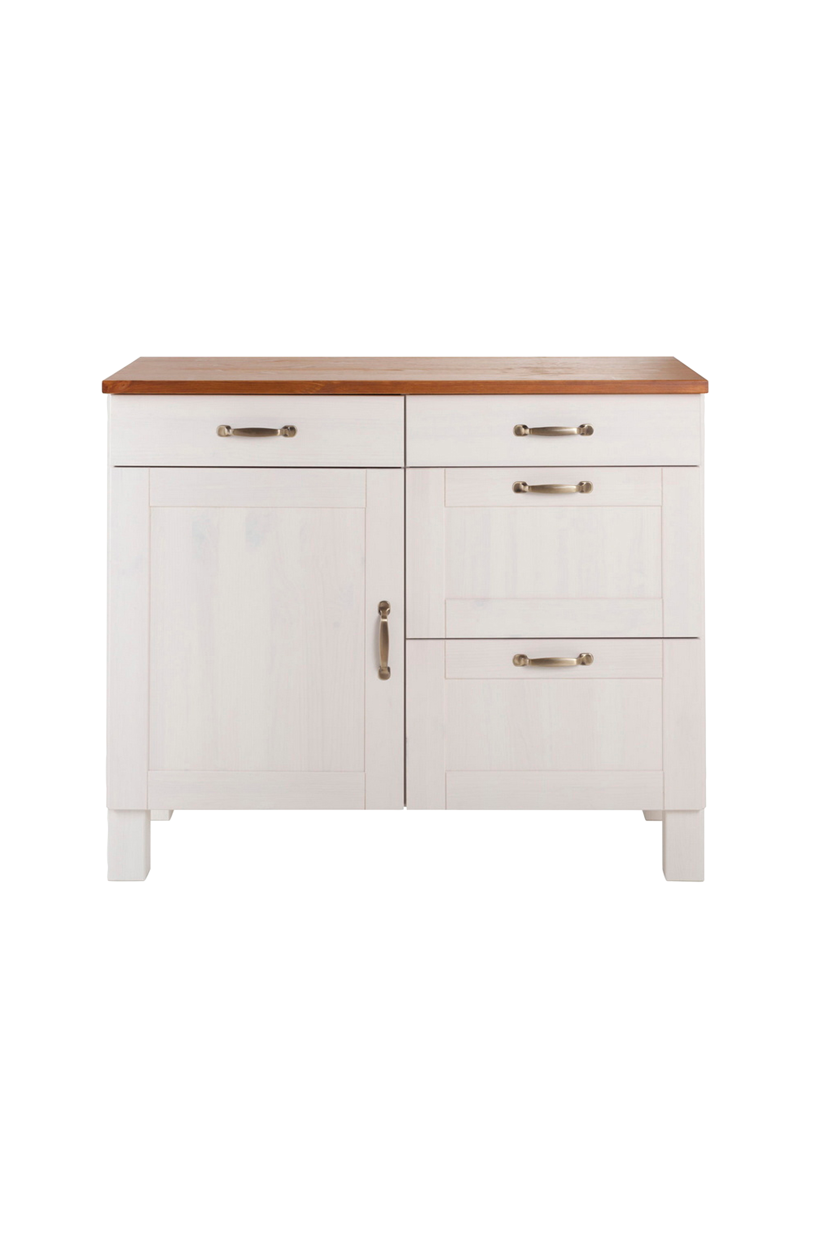 För ett inbjudande kök med lantlig känsla: Underskåpet övertygar med genomtänkta funktioner och ett tilltalande utseende. Med olika lådor och ett skåp erbjuder detta köksskåp ett brett utbud av förvaringsutrymme. De två övre lådorna är perfekta för bestick och andra köksredskap, medan de rymligare lådorna och skåpfacken är perfekta för porslin eller förvaring av mat. Underskåpet är helt tillverkat av fsc-certifierad massiv furu. Skåpet och bänkskivan finns i olika, fantastiska färgkombinationer. De dekorativa metallhandtagen avrundar den värdefulla helhetsbilden av denna köksmöbel. Modern lantlig stil med hänsyn till praktiska aspekter - köksenheten uppnår detta med inspirerande lätthet.