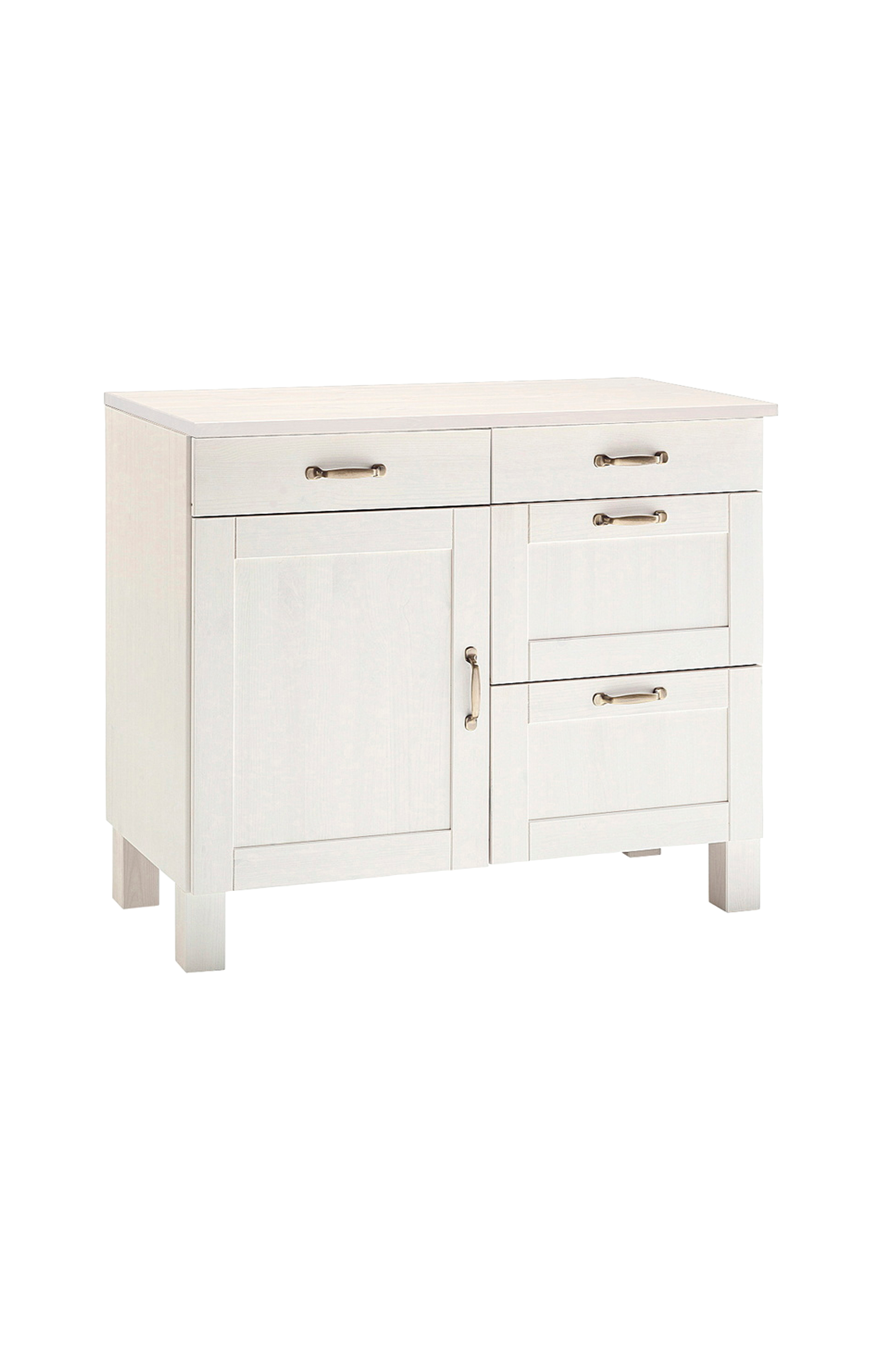 För ett inbjudande kök med lantlig känsla: Underskåpet övertygar med genomtänkta funktioner och ett tilltalande utseende. Med olika lådor och ett skåp erbjuder detta köksskåp ett brett utbud av förvaringsutrymme. De två övre lådorna är perfekta för bestick och andra köksredskap, medan de rymligare lådorna och skåpfacken är perfekta för porslin eller förvaring av mat. Underskåpet är helt tillverkat av fsc-certifierad massiv furu. Skåpet och bänkskivan finns i olika, fantastiska färgkombinationer. De dekorativa metallhandtagen avrundar den värdefulla helhetsbilden av denna köksmöbel. Modern lantlig stil med hänsyn till praktiska aspekter - köksenheten uppnår detta med inspirerande lätthet.
