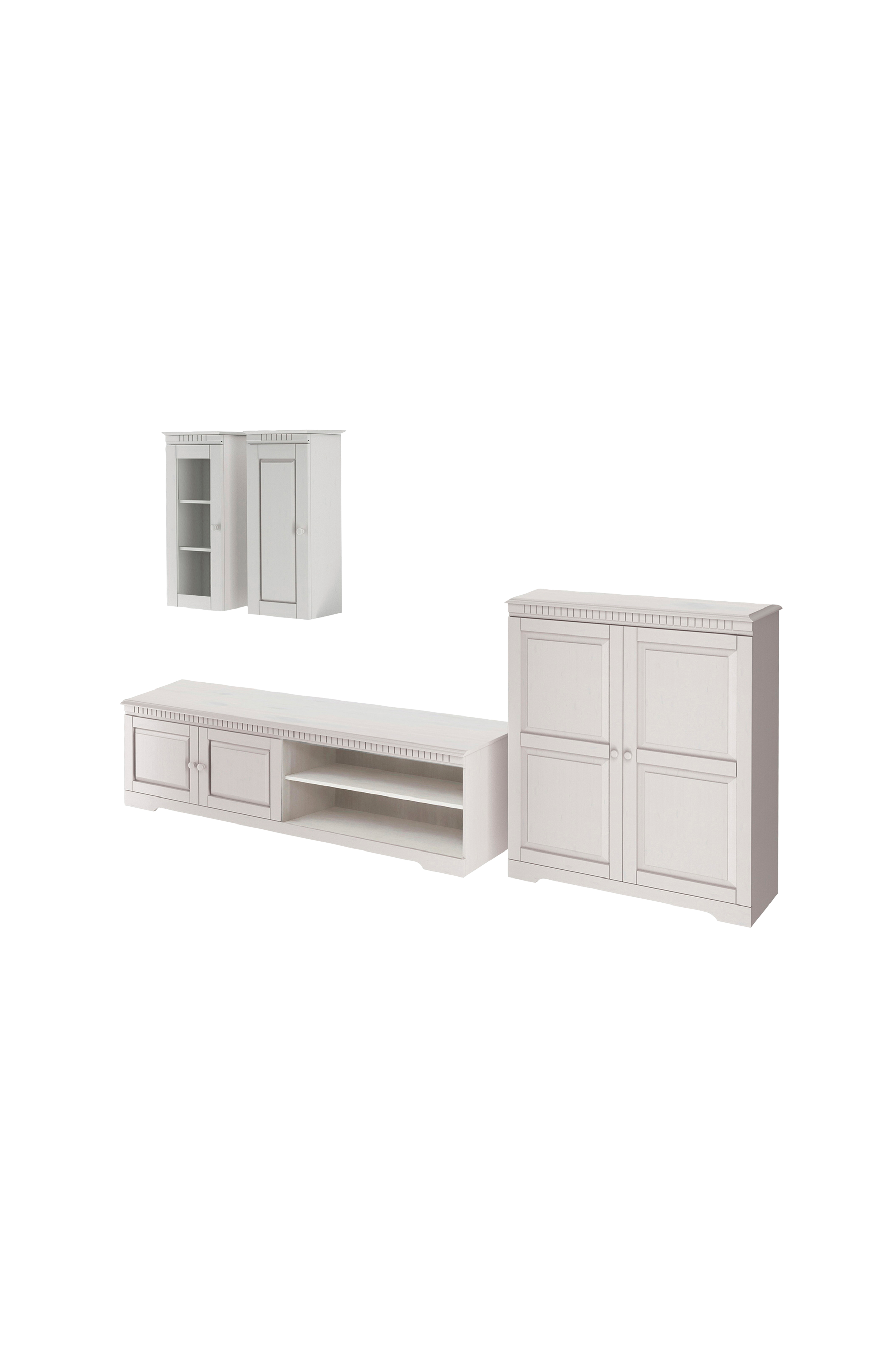 Det enkla och tidlösa möbelsetet är tillverkat av fsc-certifierat, massivt furuträ som kommer från ansvarsfullt skötta skogar och presenterar sig i en mysig lantlig stil. Trästrukturens synlighet och kvistar är en del av varje möbels individuella utseende. De dekorativa fräsningarna ser bra ut! Vardagsrumssetet i 4 delar består av två väggmonterade skåp, en tv lowboard och ett midiskåp som erbjuder gott om förvaringsutrymme. Låt träets naturlighet övertyga dig. Finns i olika färger.