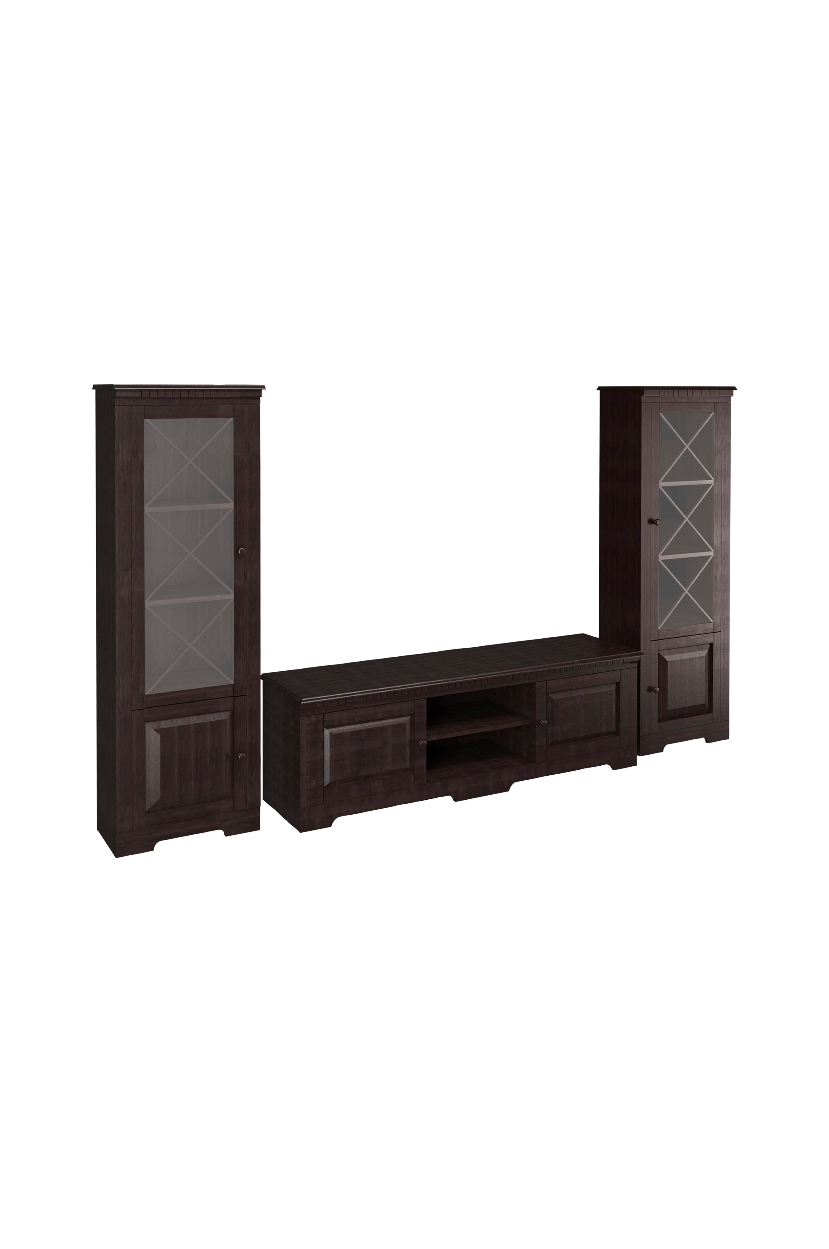 Väggskåpet lisa är en vacker och funktionell möbel för vardagsrummet. Den är tillverkad av furu i lantlig stil och har ett fsc-certifikat, vilket innebär att den är tillverkad av miljövänligt trä. Väggskåpet består av två vitrinskåp, ett på varje sida, och en lowboard i mitten. Vitrinskåpen har glasdörrar och hyllor där du kan ställa ut dina favoritsaker. Lowboarden har två trädörrar och två öppna hyllor, där du kan förvara dina mediaenheter. Väggskåpet lisa är ett mysigt och charmigt tillskott till ditt vardagsrum.
