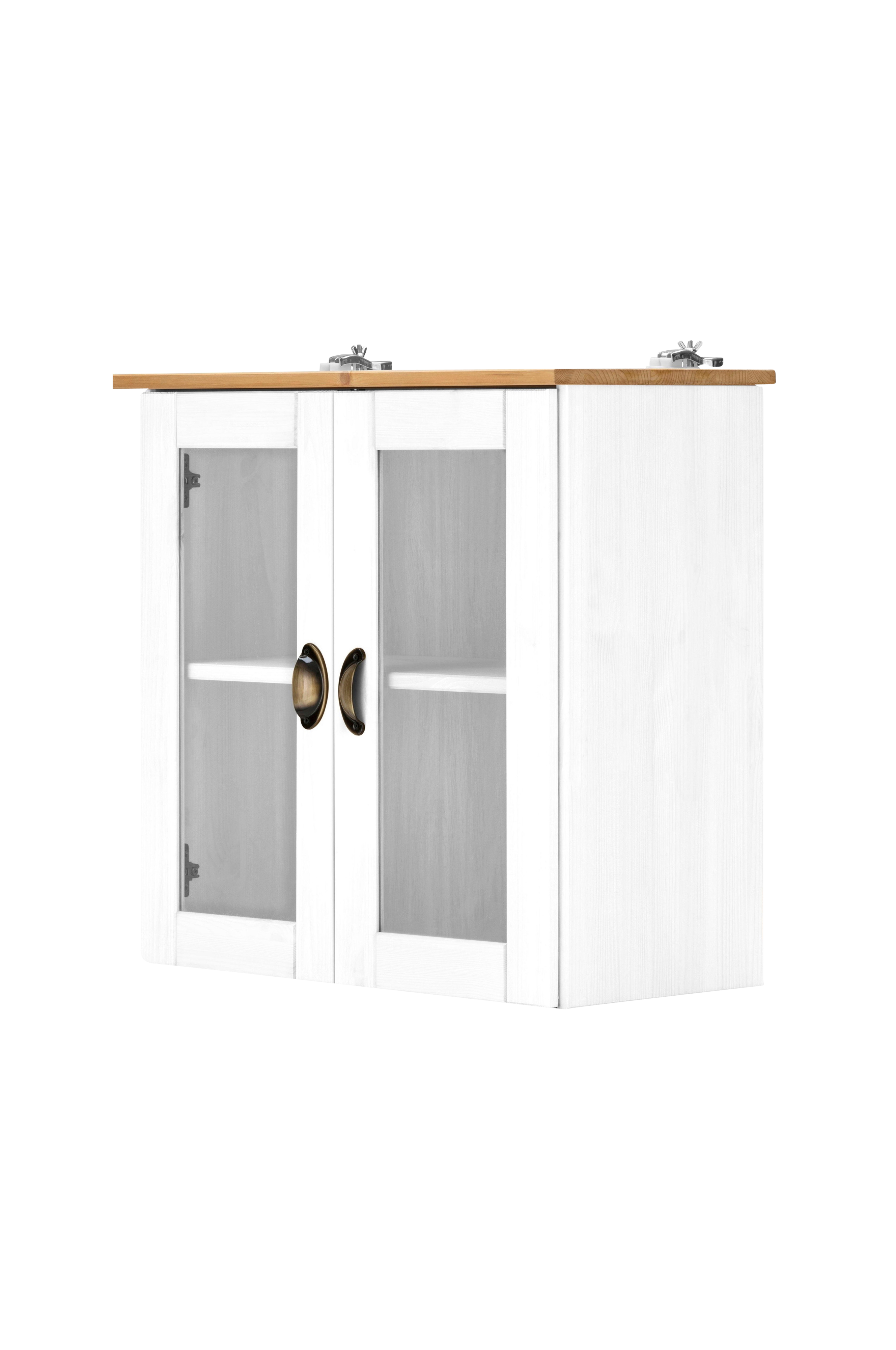 Med väggskåpet i en modern lantlig look får du förvaringsutrymme för ditt kök eller badrum. Designen kännetecknas av en attraktiv blandning av material. Stommen och dörrarnas ram är tillverkade av furuträ, som imponerar med sin tydligt synliga struktur. Glaselement är integrerade i dörrarna. Utseendet avrundas av skalhandtagen av metall. Invändigt erbjuder hängskåpet gott om förvaringsutrymme tack vare de rymliga facken. Massivt trä från en fsc-certifierad produktion används för detta väggmonterade skåp.