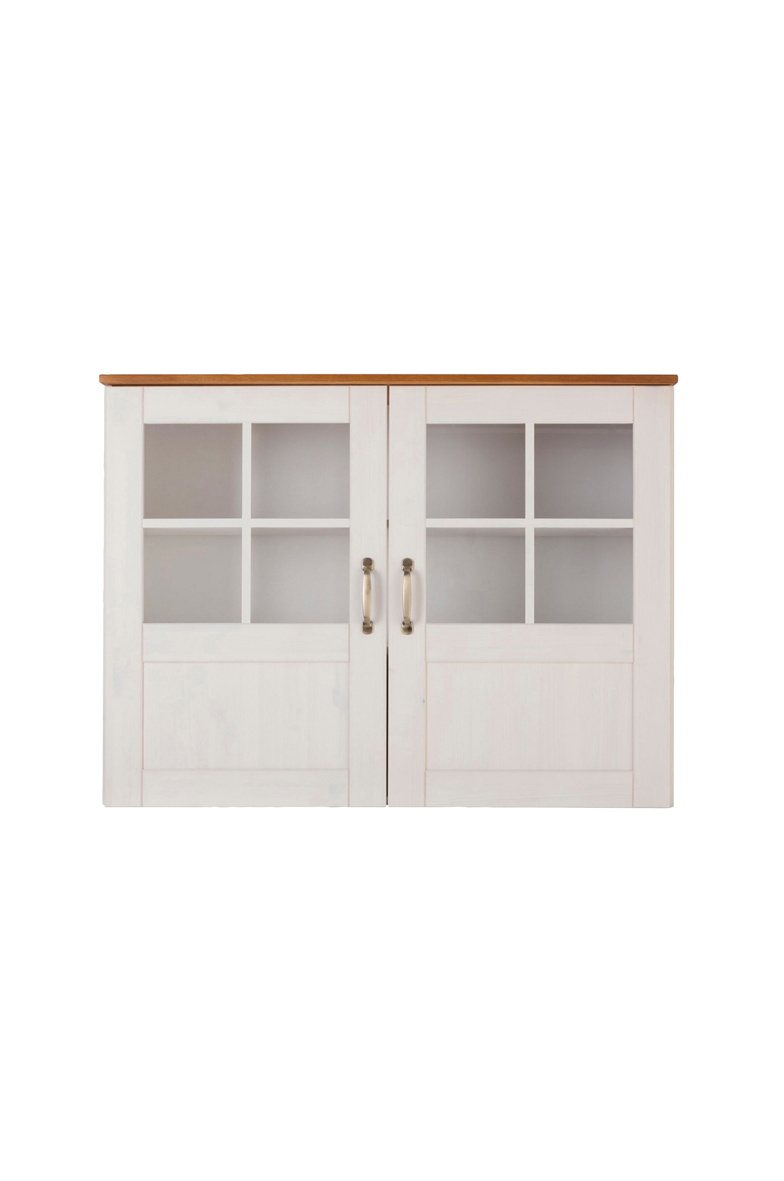 Detta 2-dörrars väggskåp i lantlig stil imponerar som en attraktiv köksmöbel. Det kan enkelt kombineras med andra färger och inredningsstilar, samt med andra möbler från samma kollektion. Kombinationen av glaselement, ett metallhandtag och material skapar en elegant helhet som passar in i nästan alla rumskoncept. Tack vare hyllorna finns det gott om förvaringsutrymme inuti för att förvara dina glasartiklar. Möbeln är tillverkad av fsc-certifierat trämaterial och finns i fler färgvarianter.