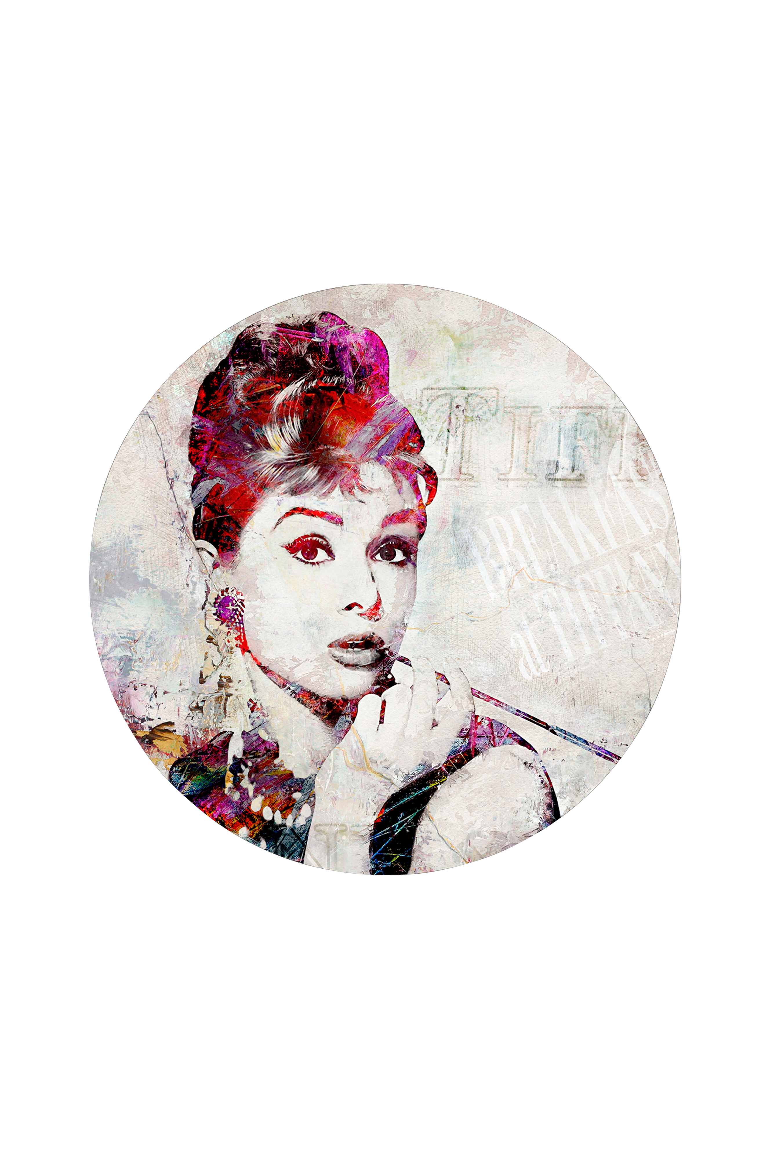 Tavla Audrey från Malerifabrikken. Tryck på rund MDF-platta. När tavlan är upphängd, gör profilen på plattan att fronten "svävar" ca 0,5 cm från väggen.
