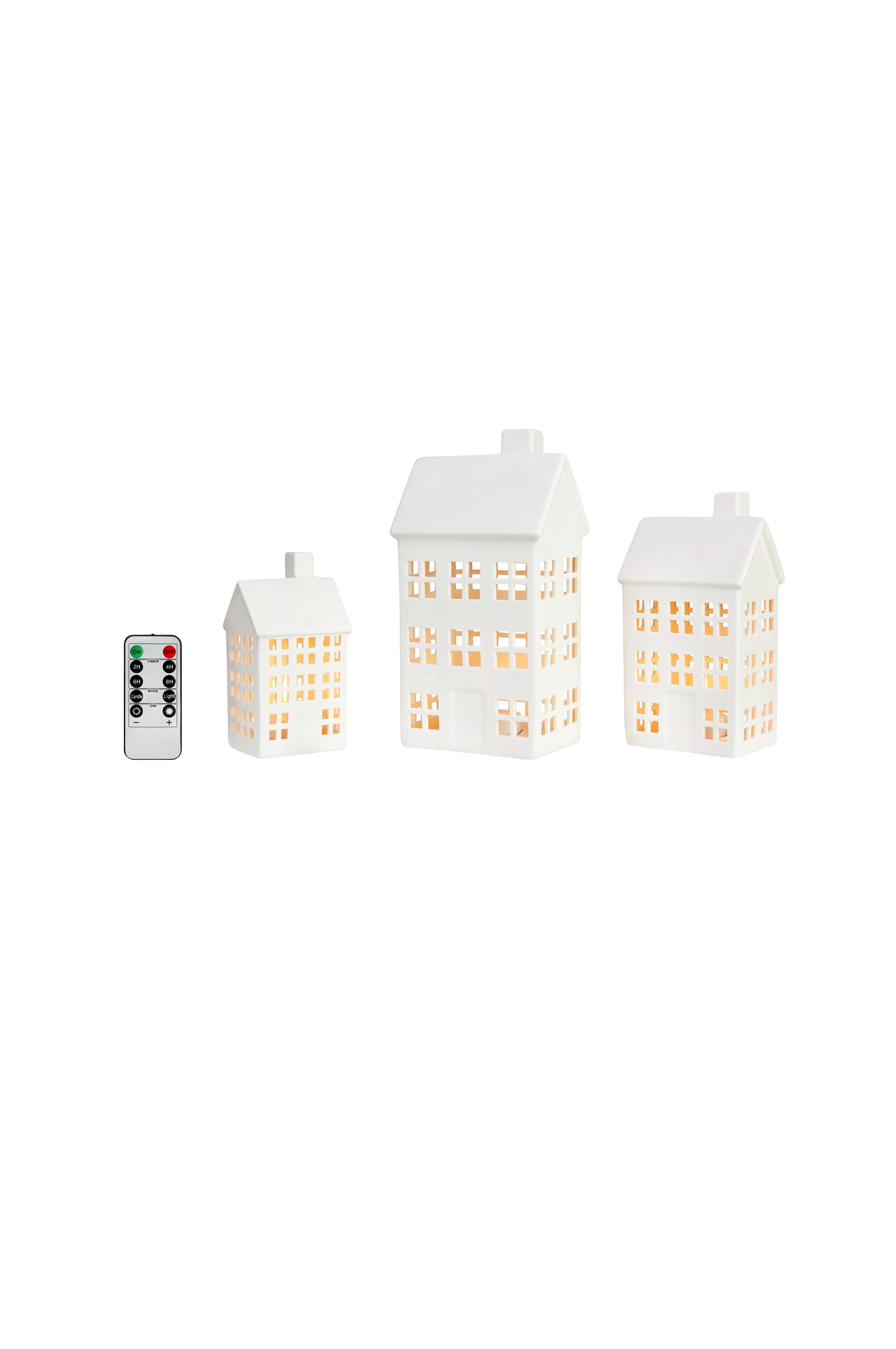 Eton bordsdekoration från markslöjd. 3-staviga hus i keramik. Höjd hus, 21,5cm, 17,5cm och 13,4cm. Inklusive fjärrstyrda led-värmeljus i ett paket om 3. Uppladdningsbara värmeljus i plast. Timerfunktion för 2,4,6 och 8 timmar. Justerbar ljuseffekt, konstant eller flammande. Konstant ljus i 4 dimbara steg. 1 m usb-c-kabel ingår. Strömbrytare under varje ljus.