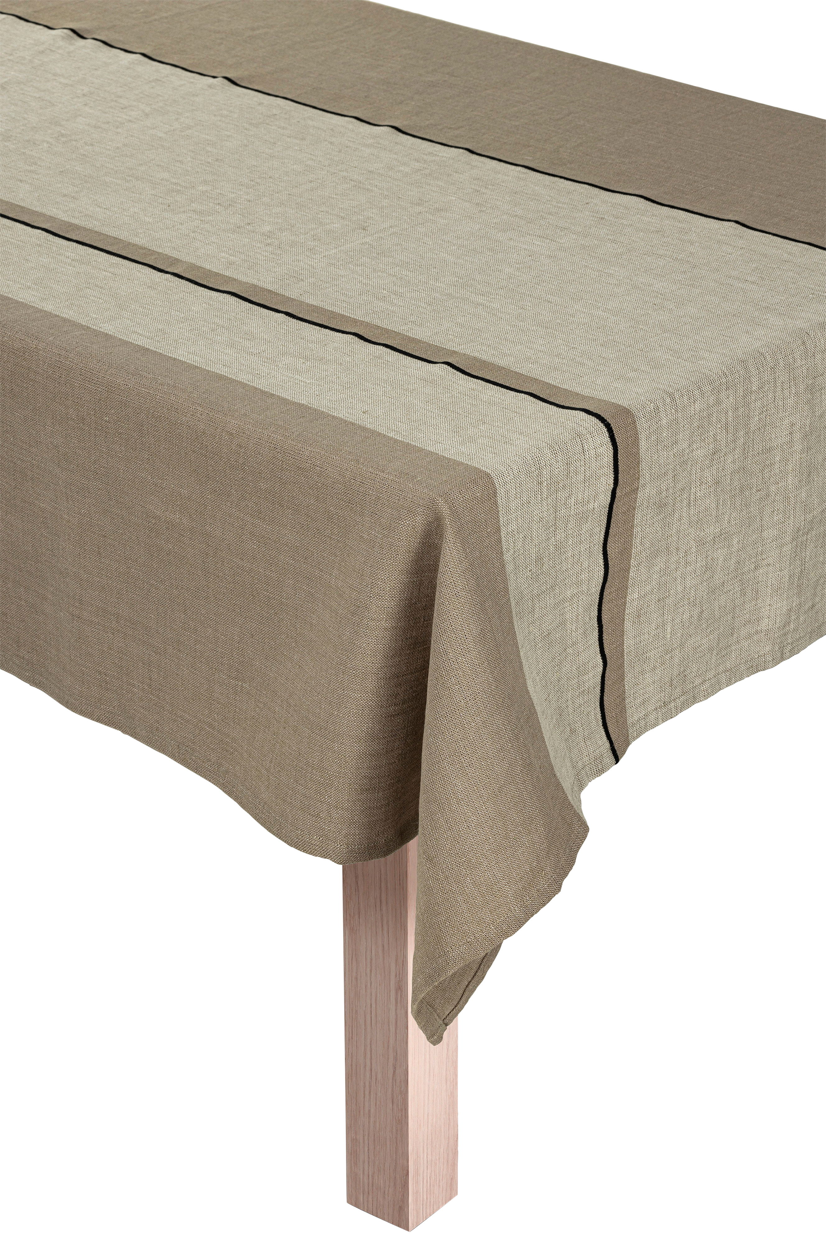 Öda bordsduk från markslöjd. Beige, offwhite duk med en svart broderad rand i mitten av duken. 100% linne (euroflax) och oeko-tex 100 certifiering, vilket innebär att linnet kommer från europa och att textilen är fri från skadliga kemikalier. Storlek 156x250cm. Kan tvättas i 40 grader. Tillverkad i indien. Designad av ann ringstrand.