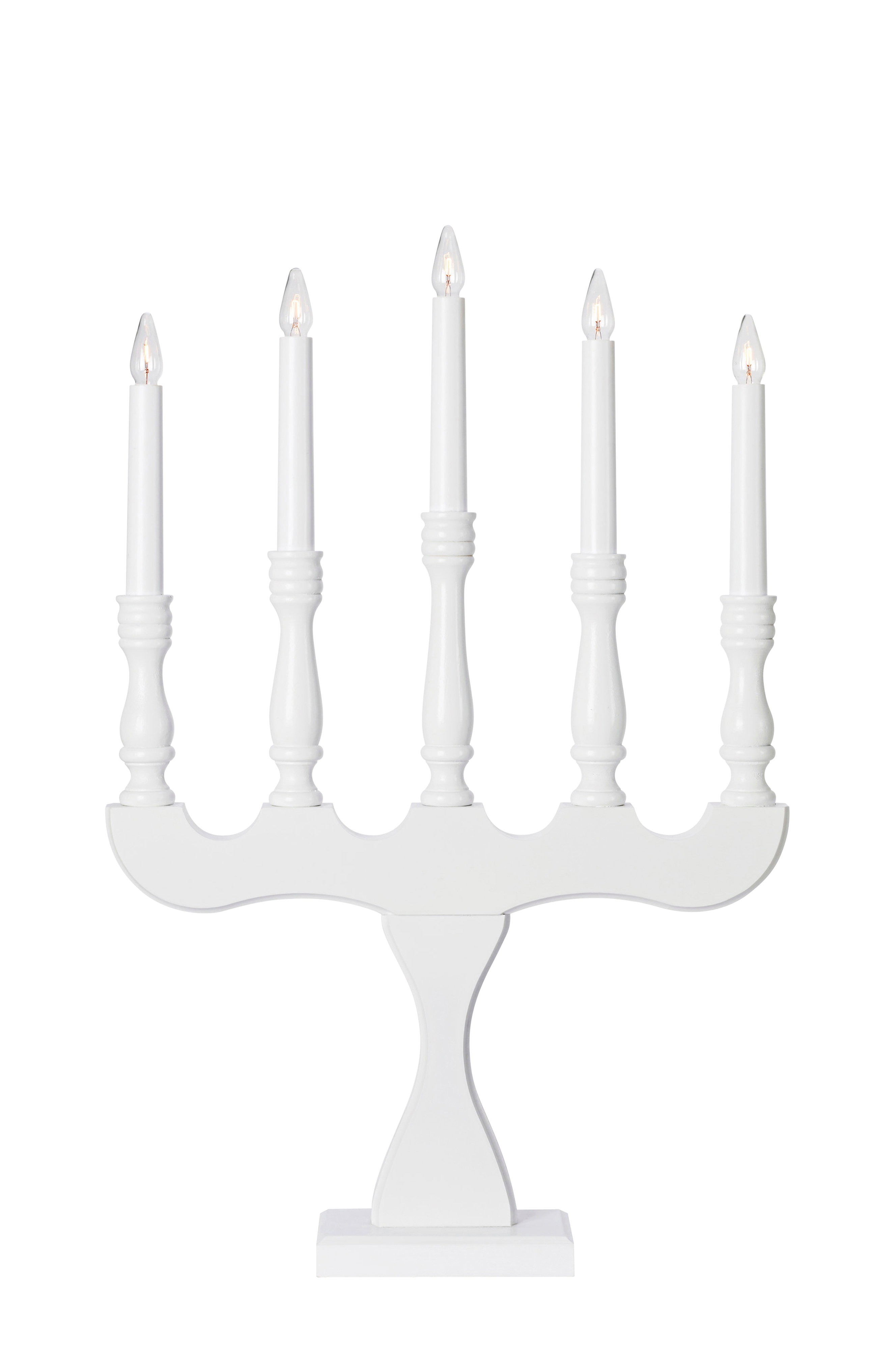 Svaneholm ljusstake från markslöjd. Bas i vitt trä och ljus i vit plast. 2m vit pvc-kabel med strömbrytarsladd och väggkontakt. 5xe10, max 3w. Ljuskällor ingår.
