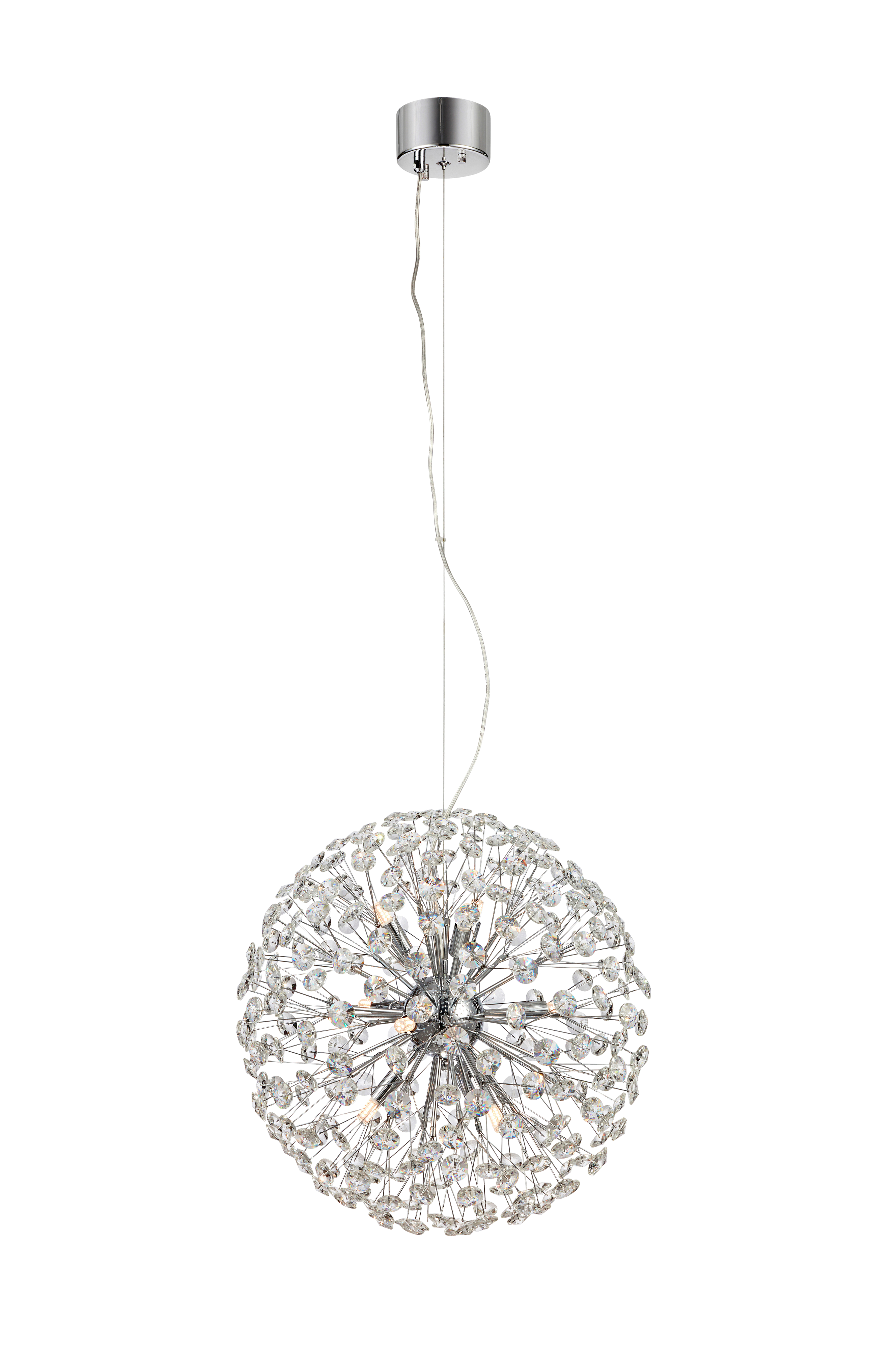 Bolid taklampa i krom och klara prismor i glas. Krokupphäng. 9xG9, Max 20W. 1,5 meter transparent kabel. Takkontakt och ljuskällor ingår ej. Jordad.