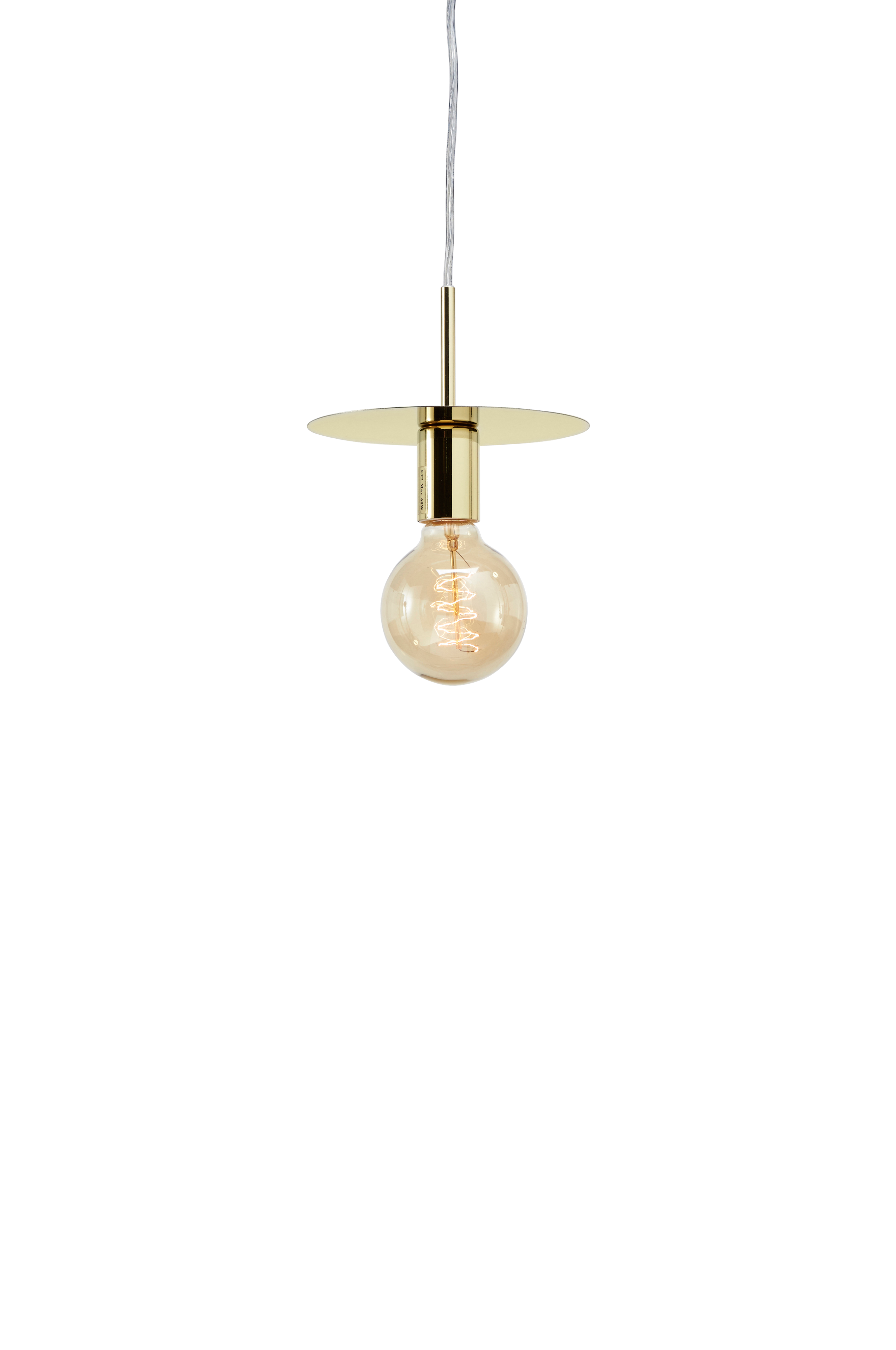 Disc taklampa med skärm och bas i metall. 1,5m sladd med U-bygel. Fast installation. Stor lamphållare (E27). 1x60W glödlampa eller motsvarande styrka i halogen, lågenergi eller LED. Ljuskälla ingår ej.