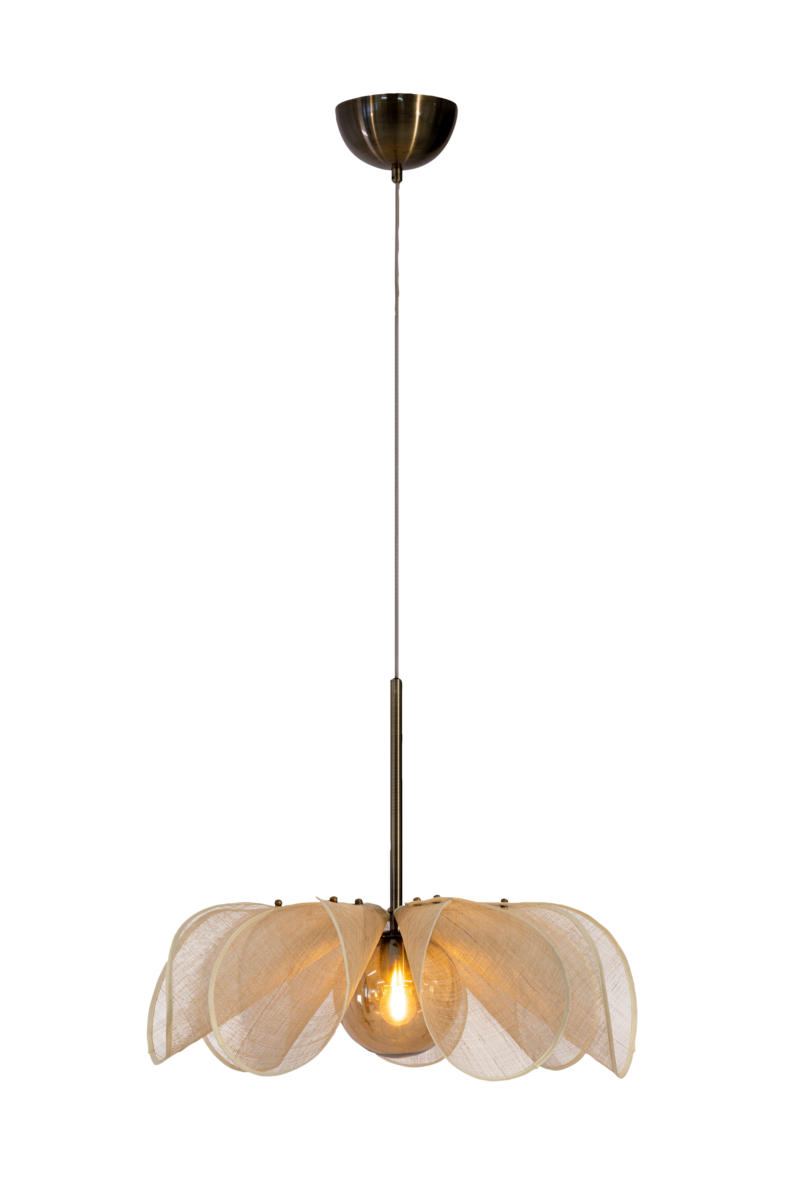 Takpendel med en design som påminner om en blomma. Skuggan i bananfiber ser ut som kronbladen. Under kronbladen finns ett runt glas som släpper igenom ett behagligt stämningsljus från ljuskällan som är monterad inuti glaset. Varje kronblad är monterat separat med två muttrar som också utgör en intressant detalj i designen. Materialet i kronbladen är skirt och stabilt, med en textur som påminner om linne. 2 m textilkabel och takkopp i metall. Lampan har en storlek på 63 cm i diameter. Design Anja & Filippa.