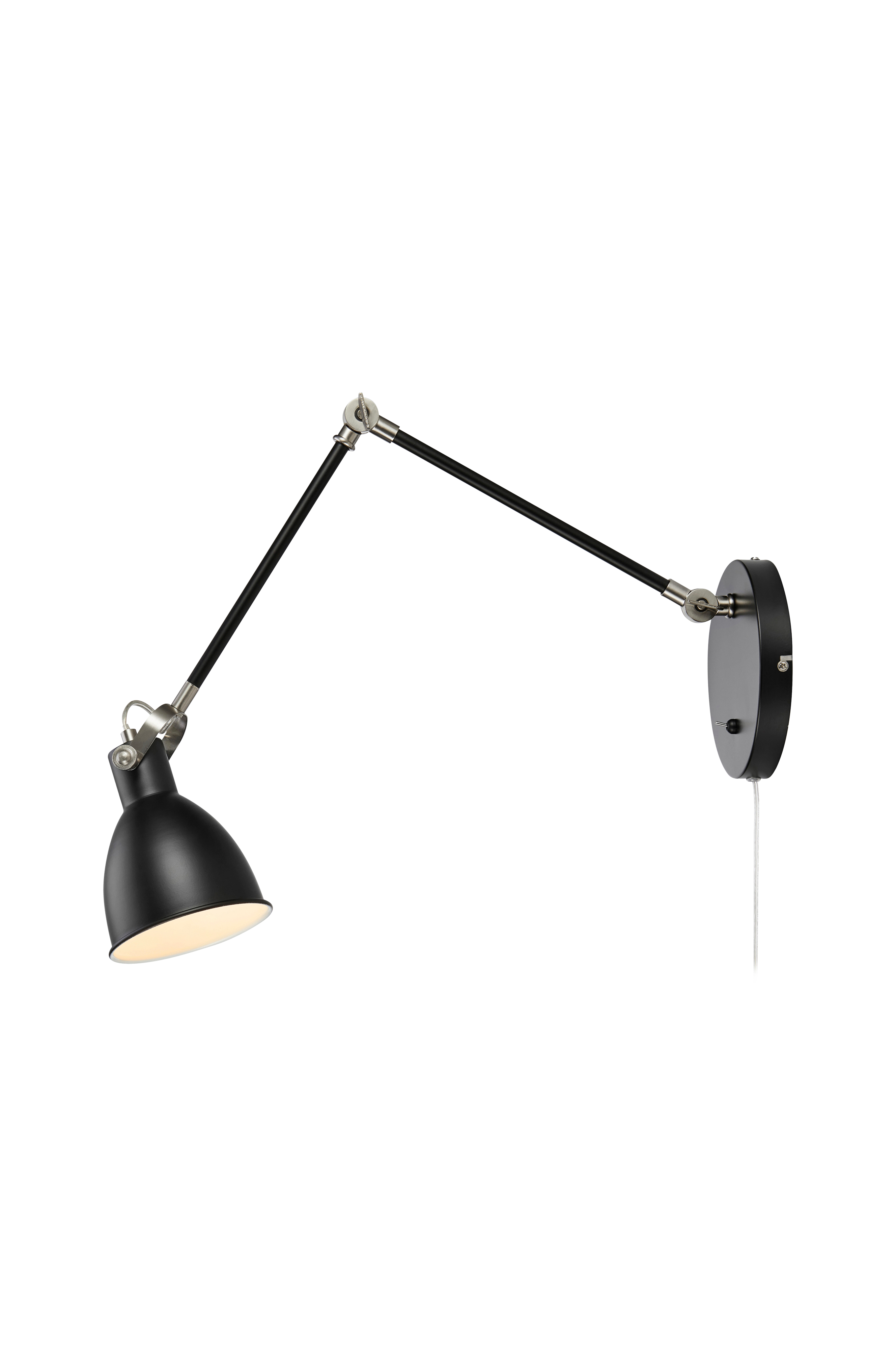 Vägglampa House från Markslöjd är i metall med detaljer i stål. Den har en 200 cm lång kabel i plast och stickkontakt. Strömbrytare finns på väggplattan. Monteras med bygel. Ljuskälla ingår ej.