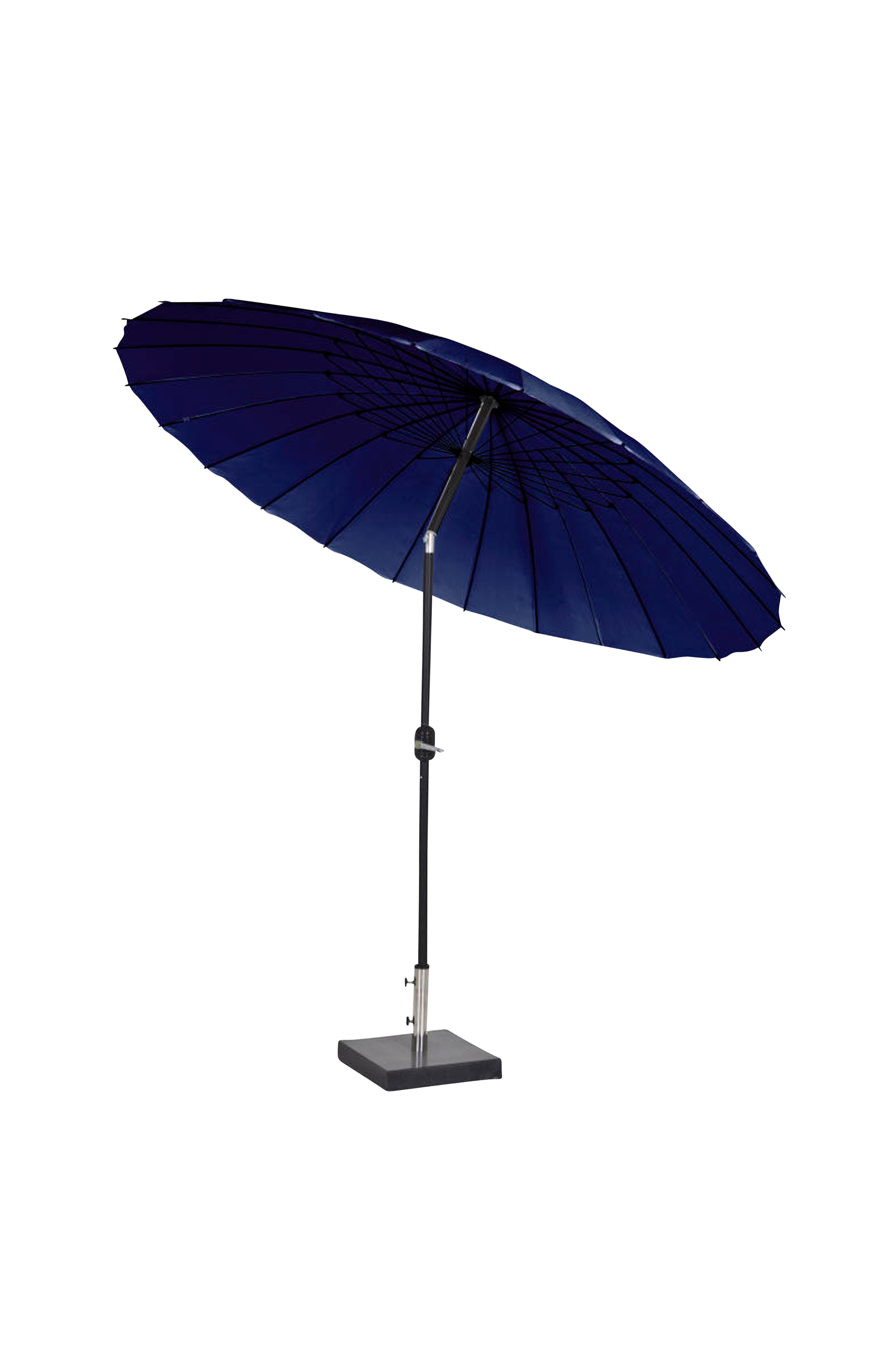 Parasoll med pulverlackerad aluminiumstolpe och stålribbor. Med vev och tiltfunktion. Tillverkad med en 160 g polyester. Levereras utan fot.