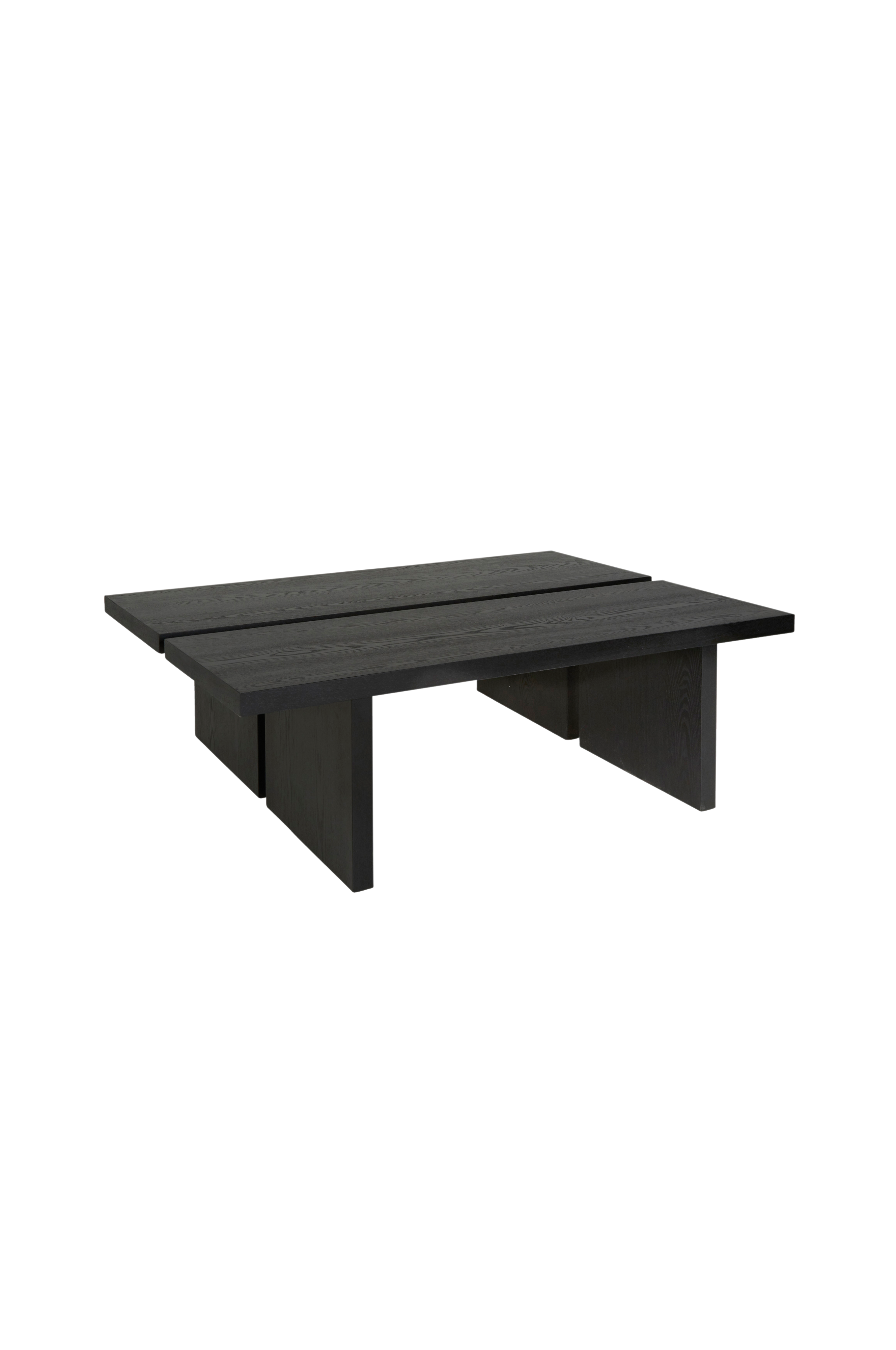 Stilrent tvådelat soffbord i svart askfaner på MDF. Bordet är i två delar och kan därför användas som två separata bord.