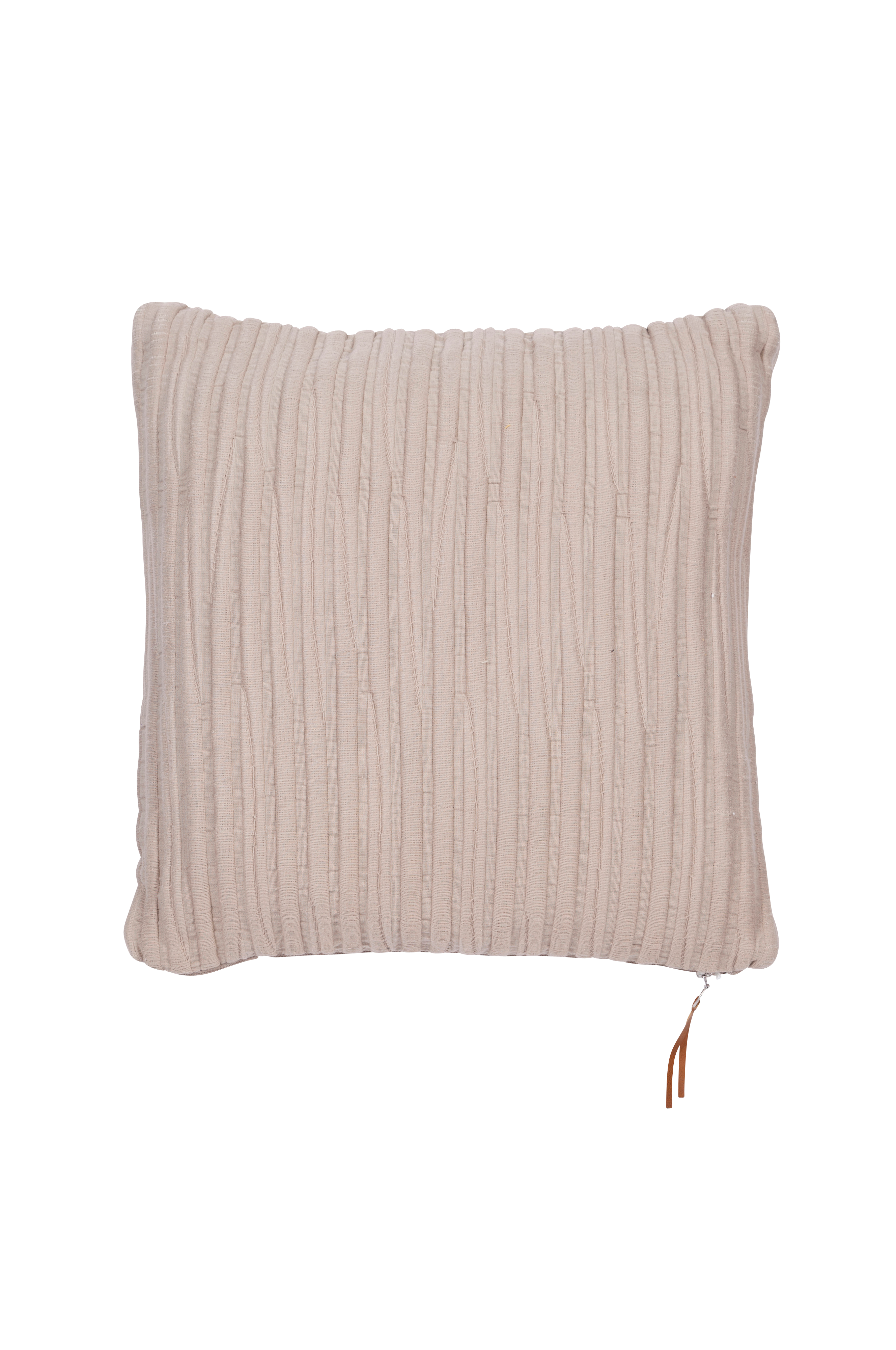 Kuddfodral i ribbad grov kvalitet med struktur. Dragkedja med guldfärgad ring och dekorativt läderband. Stl 45x45cm. Endast kemtvätt.