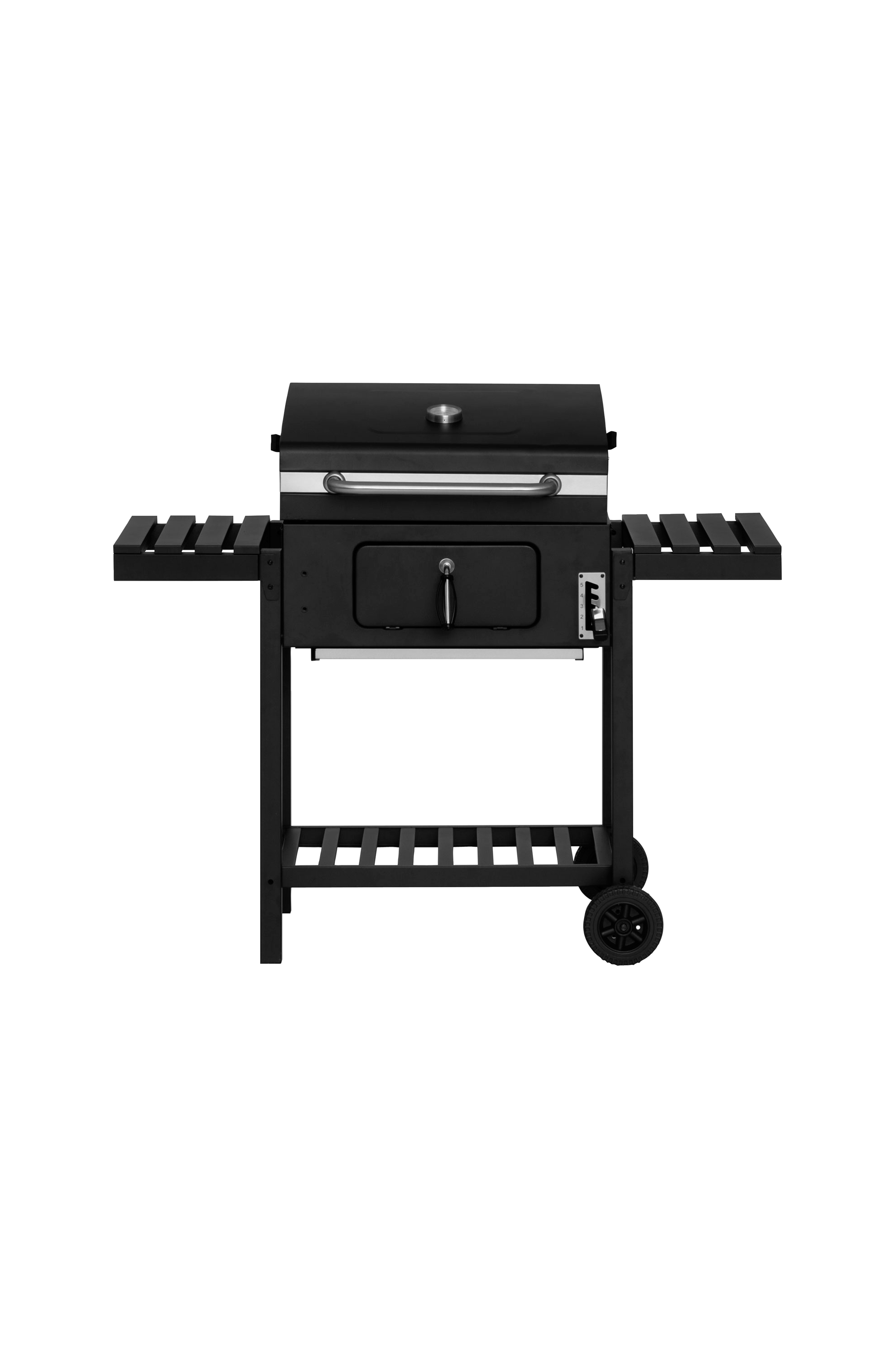 Ventiler på båda sidor av locket för att justera draget när locket är stängt. Termometer i locket. Stadig vagn med sidobord och underhylla. 2 stora hjul för enkel förflyttning.
