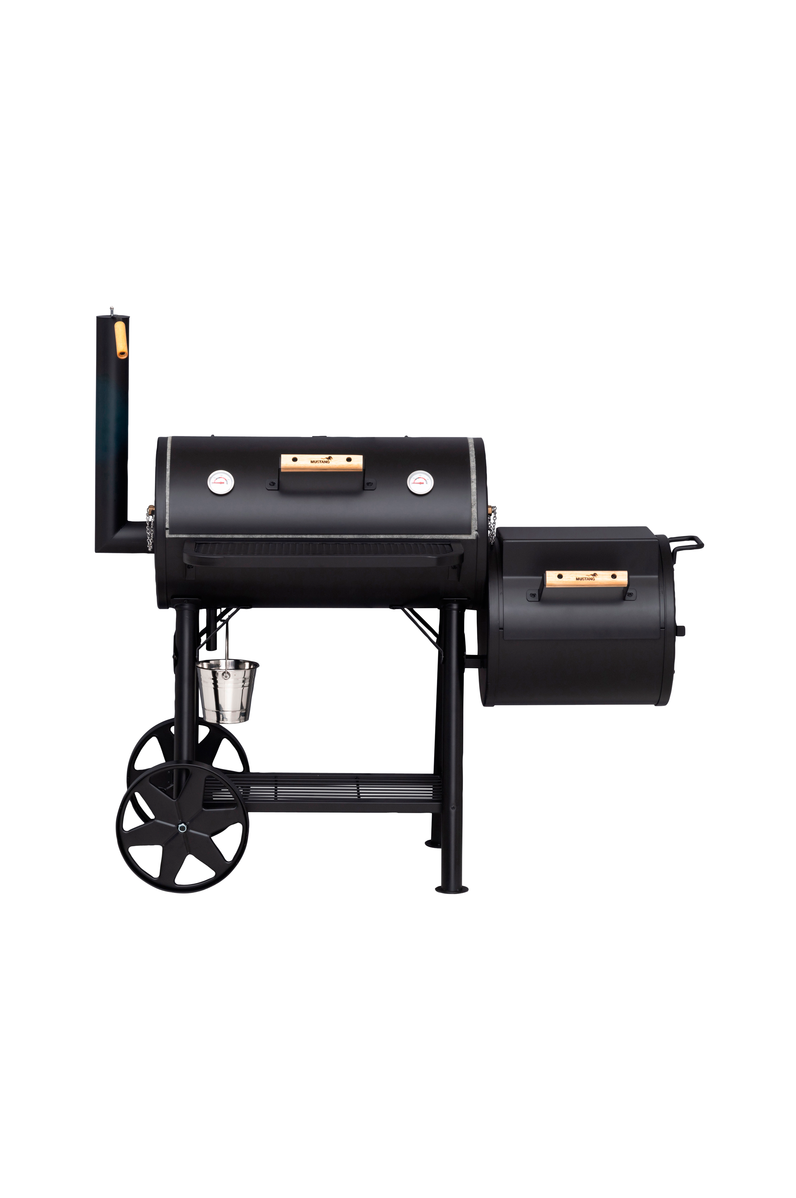 Den stora tunnan är förberedd för användning av Mustangs rotisseri 312849, tunnan har även två små luckor där du kan trä igenom sladden till din digitala termometer. Den har även stora hjul av stål för enkel förflyttning.