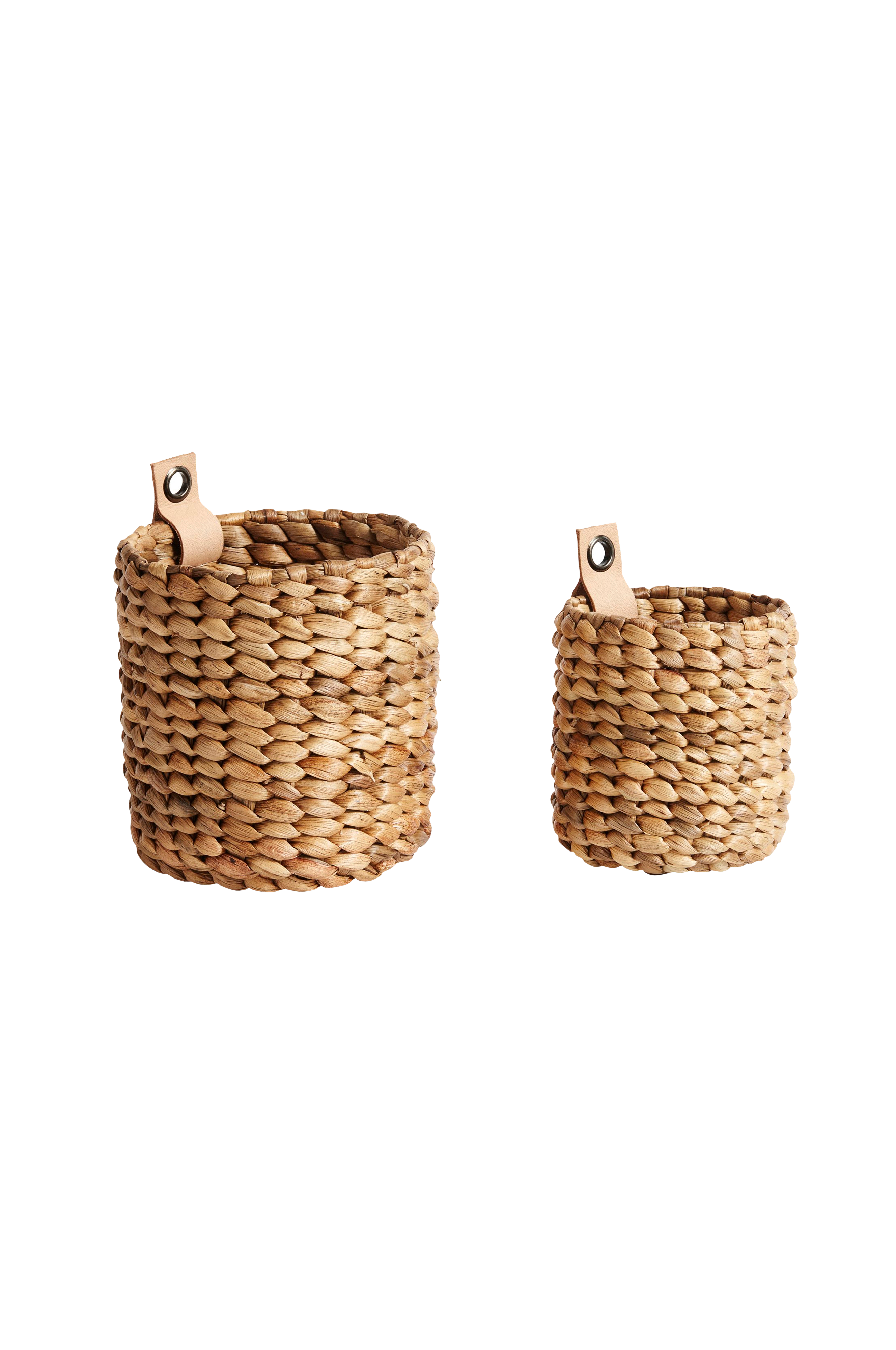 Set med två naturfärgade minikorgar av vattenhyacint från Muubs. Korgarna är handflätade av lokala korghantverkare i Indonesien. De är designade med ett litet läderband, vilket gör det möjligt att hänga dem i t.ex. en liten krok. Man kan hänga dem på Köpenhamnsstegen som förvaring. Krokar ingår ej.