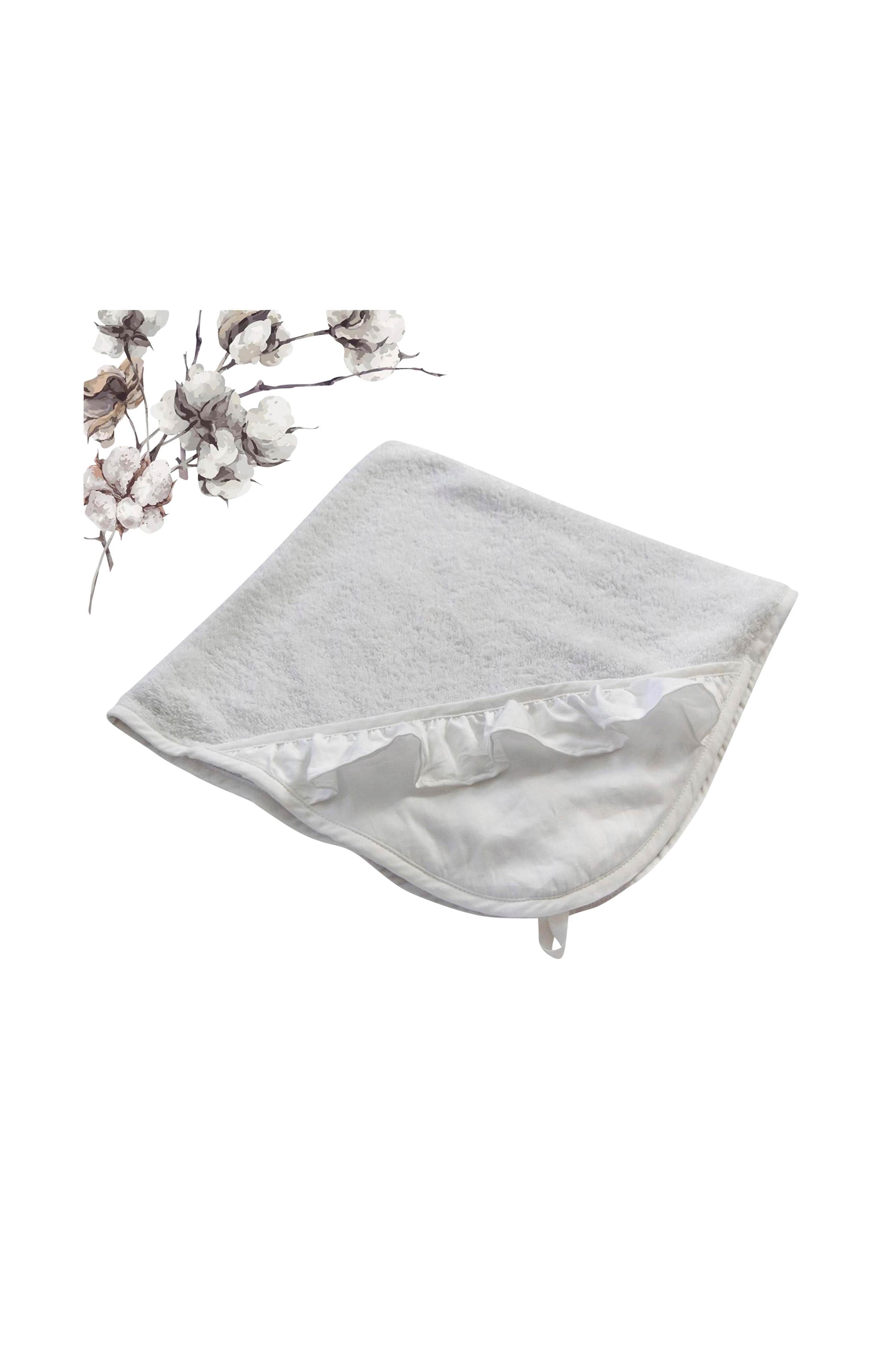 Hur mysigt är det inte att svepa in sitt nybadade barn i en mjuk, skön badcape. Denna badcape har en praktisk huva med gullig volang som extra detalj. Huvan gör att capen blir på även om barnet springer runt, vilket passar lika bra på stranden som hemma. Badcapen kan också användas som underlägg på skötbordet när din bebis är nyfödd. En praktisk detalj är hanken av bomullsband som gör det enkelt att hänga upp capen när den inte används.