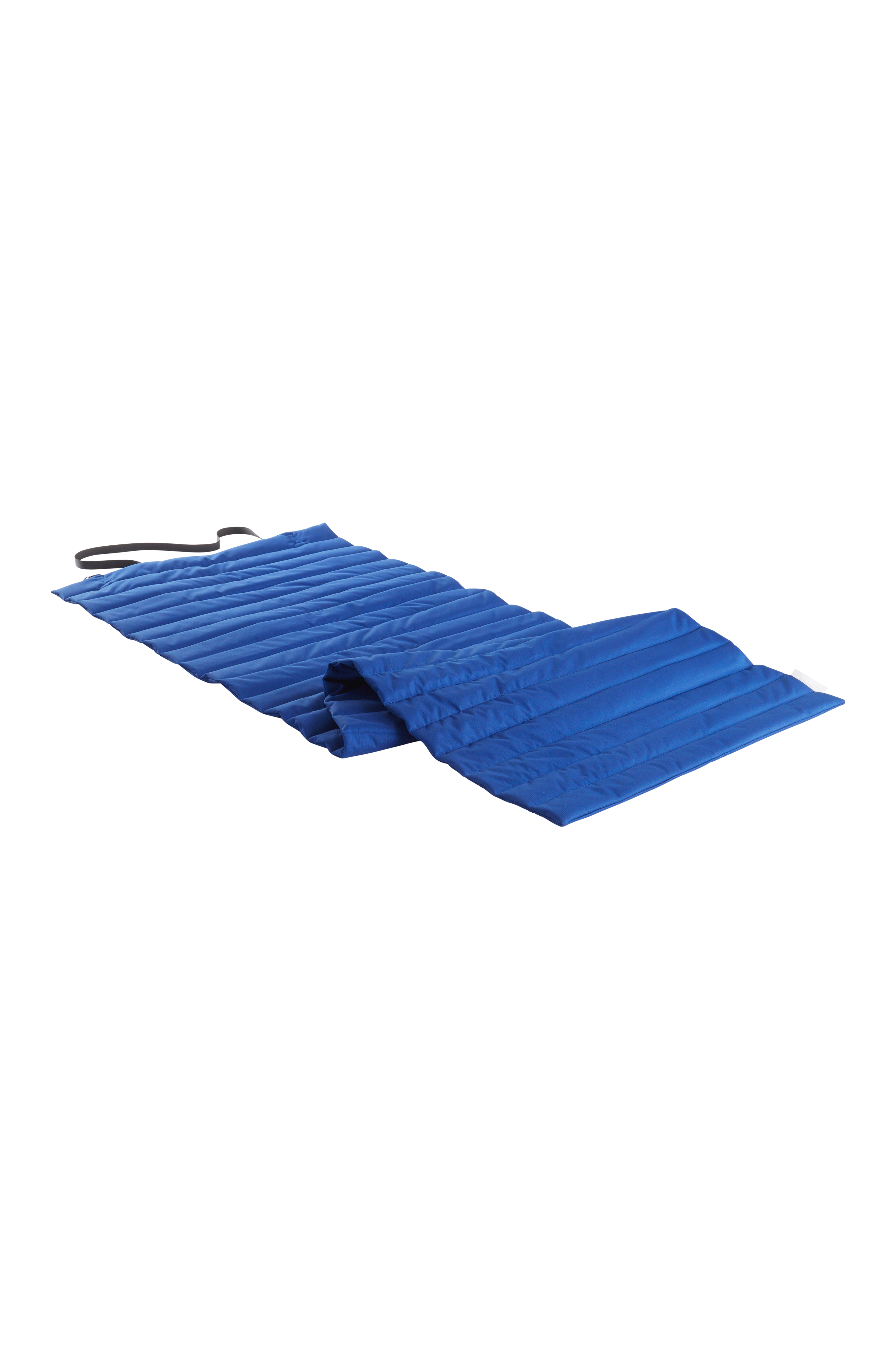 Strandmadrass med vattenavvisande yttertyg av polyester. Fyllningen är även den av polyester. Madrassen är kanalquiltad så att fyllningen hålls på plats och den blir också enklare att rulla ihop. Band runt om som öppnas och stängs med justerbara snabbspännen av plast. Bärhandtag gör strandmadrassen smidig att ta med.