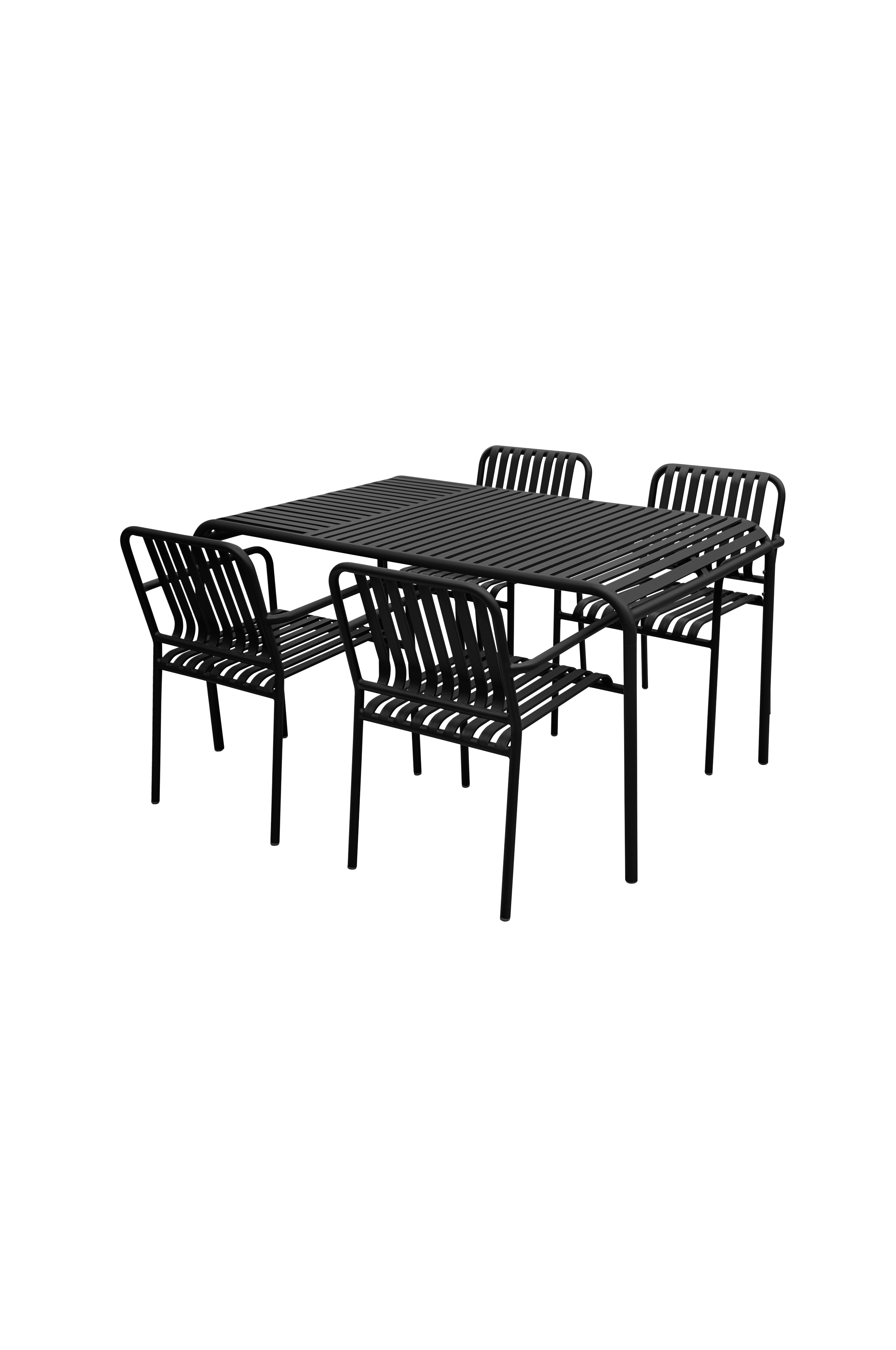 Stolarna i serien är alla mycket robusta. De har synliga snygga svetsar och raka linjer. De breda metallribborna ger också stolarna ett rent utseende. Stolen har ett långt sittdjup som gör att du kan sitta bekvämt även utan dynor. Stolarna är tillverkade av slitstark aluminium, som är ett starkt men också lätt material. Metallen är belagd för att göra den underhållsfri. Stolen är stapelbar för enkel förvaring. Trädgårdsborden i serien är alla tillverkade av robusta material. De har synliga svetsar och raka linjer, vilket ger ett intryck av att vara råa och samtidigt snygga. De breda metallskivorna ger också borden ett rent och enkelt utseende som passar in i den moderna stilen, samtidigt som de är flexibla och ovanliga. De finns också med ett helt bord i ena änden, vilket skapar ett dynamiskt utseende med lamellerna som täcker mer än hälften. Bordet är tillverkat av slitstark aluminium, som är ett lätt och starkt material. Metallen är behandlad för att göra den underhållsfri.