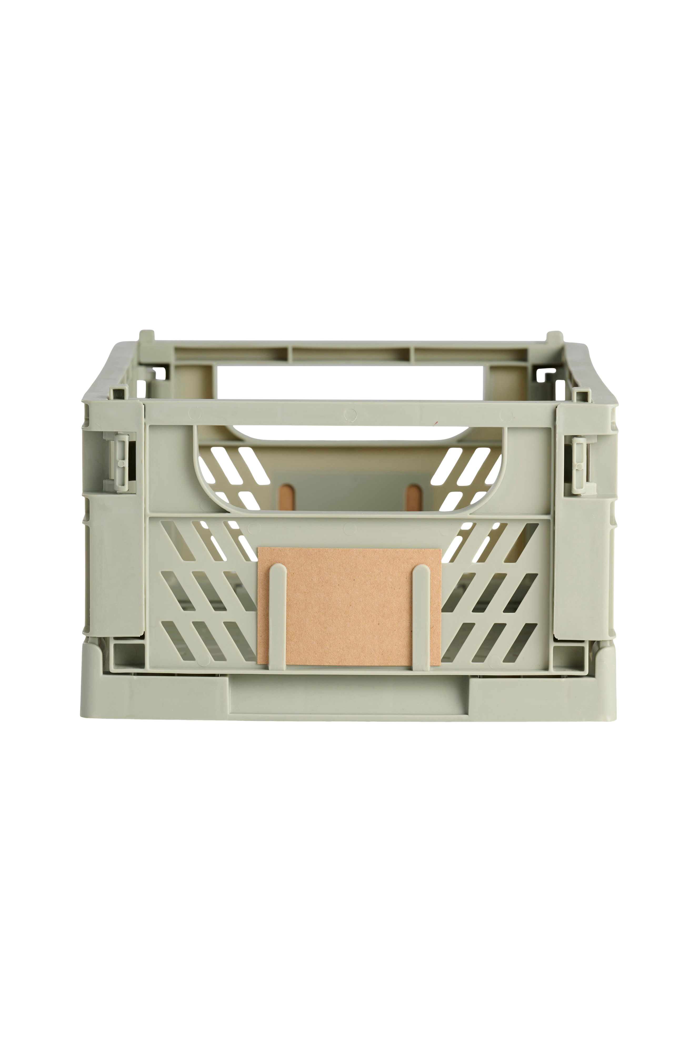 En klassisk förvaringslåda. Den är lätt att vika ihop och en liten förvaringslapp medföljer, som kan sättas fast på fram- och baksidan. Lådan tar väldigt lite plats när den är hopvikt och när den är utvikt kan den staplas säkert. Lådorna finns i flera storlekar och kan användas i till exempel köket, hobbyrummet eller ateljén. Lådan finns i flera färger.