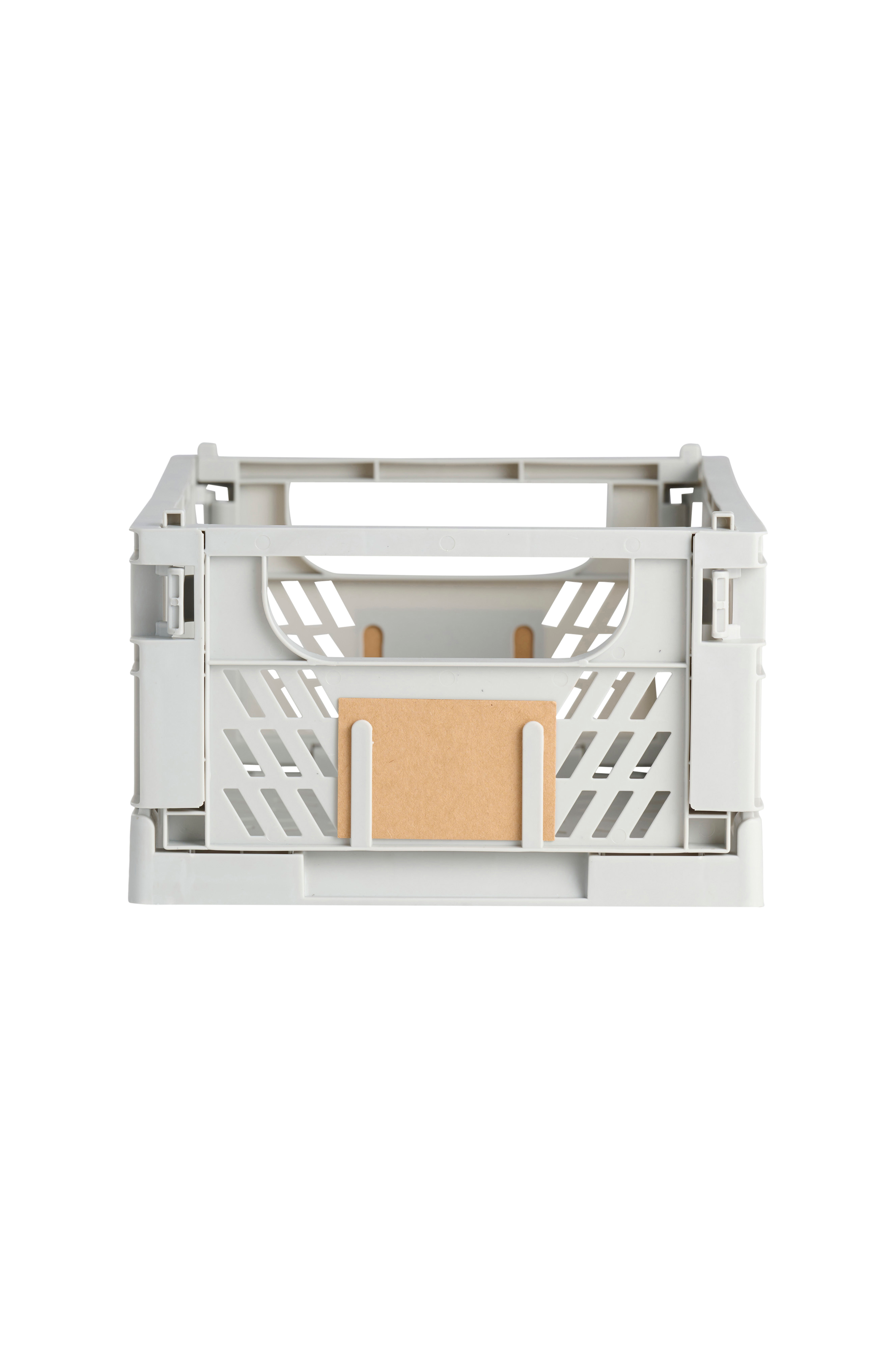 En klassisk förvaringslåda. Den är lätt att vika ihop och en liten förvaringslapp medföljer, som kan sättas fast på fram- och baksidan. Lådan tar väldigt lite plats när den är hopvikt och när den är utvikt kan den staplas säkert. Lådorna finns i flera storlekar och kan användas i till exempel köket, hobbyrummet eller ateljén. Lådan finns i flera färger.