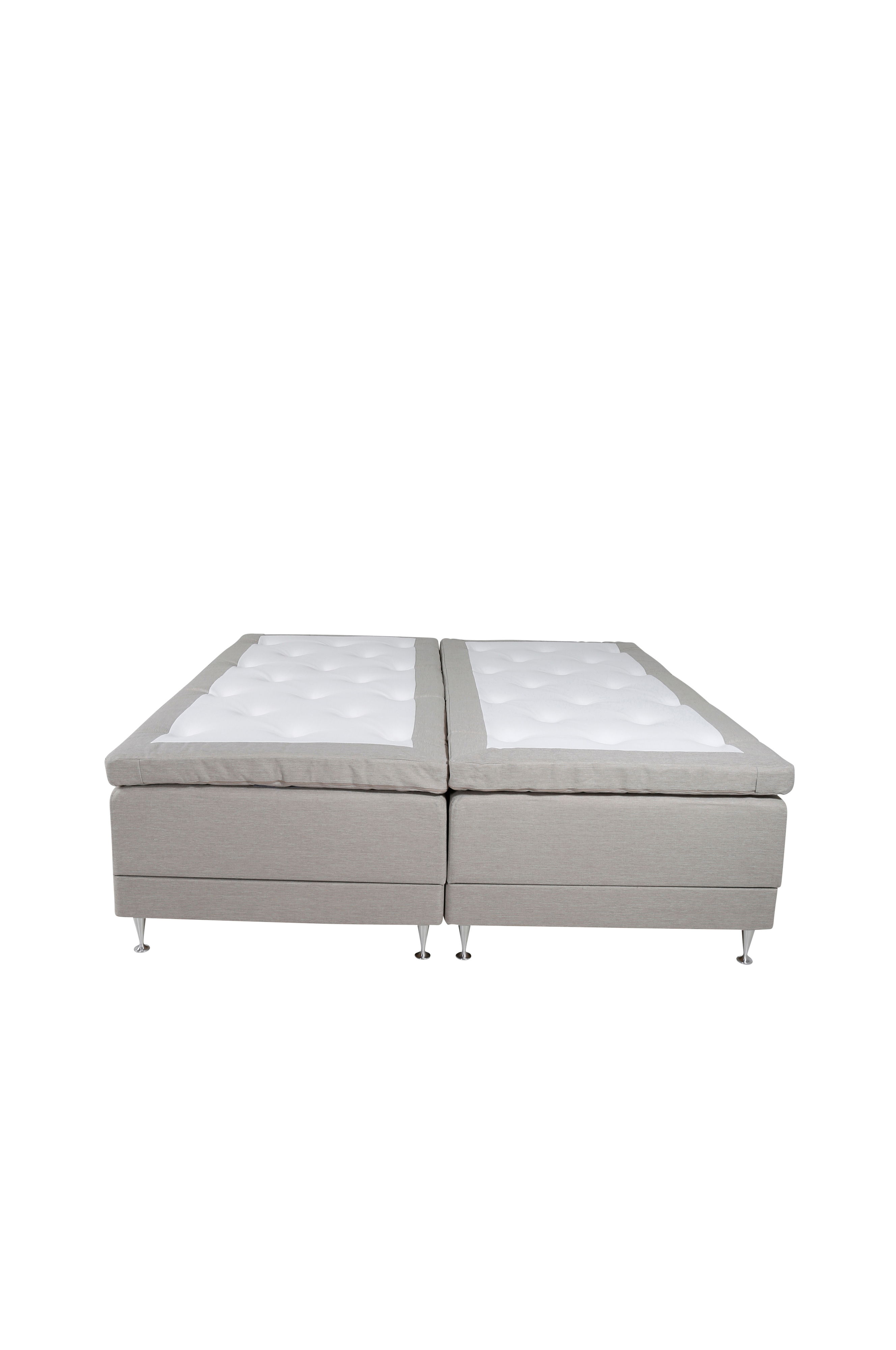 Sammantaget är sängen uppbyggd för att ge en skön sovkomfort samt ge ett enhetligt intryck i sin helklädda design. Hela sängen vilar på champangeben i silvrig aluminium.