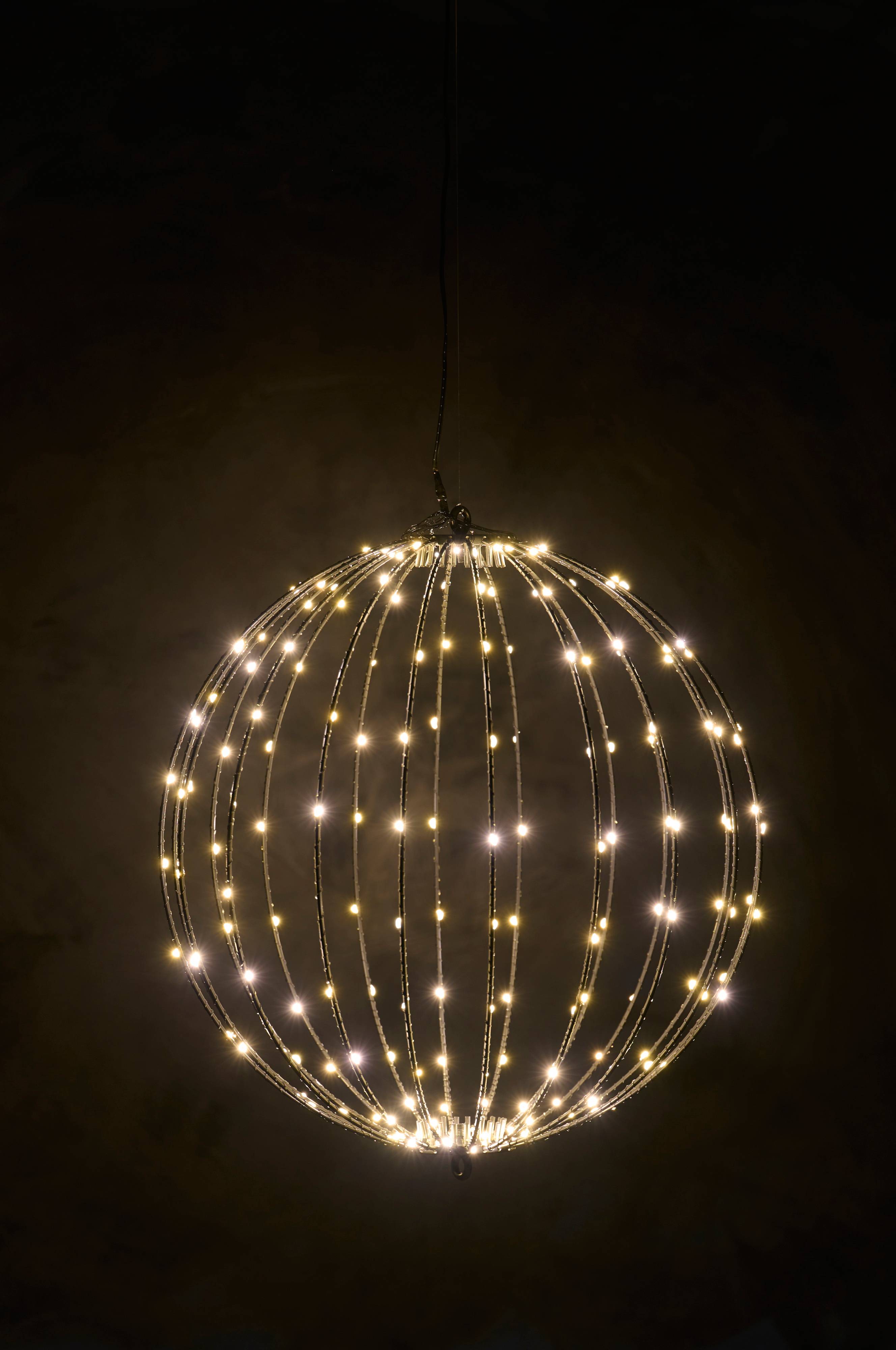 Vi presenterar vår fantastiska ljuskula med stjärnor, ett fängslande tillskott till juldekorationen från vår kollektion. Med en diameter på 35 cm är det ett himmelskt mästerverk som skapar en underbar stämning. Prydd med 160 LED-lampor, arrangerade i 10 strängar med 16 LED-lampor vardera, skapar den ett fascinerande, stjärnspäckat skådespel. Den 5 m långa sladden gör den enkel att placera, medan IP44-adaptern garanterar säker användning utomhus. Med en dubbel timerfunktionen kan du välja mellan 8 timmar på och 6 timmar av, eller 2 timmar på och 8 timmar av, för att passa dina vanor. Tillverkad av elegant, svart metall ger denna hopfällbara kula alla rum en sofistikerad känsla. Lys upp julfirandet med vår ljuskula med stjärnor, där skönhet, teknik och julkänsla strålar samman i harmoni.