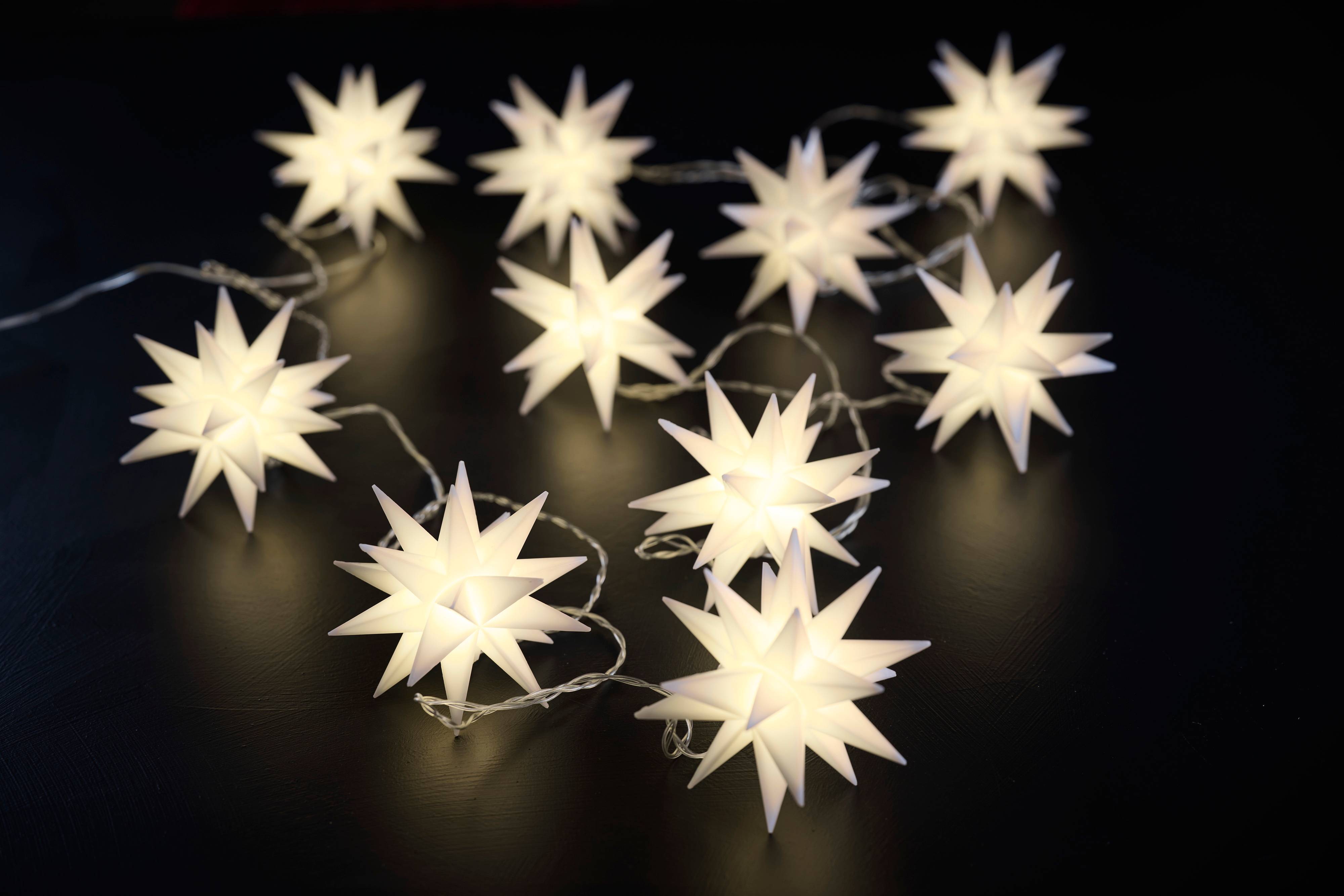 Höj nivån på juldekorationen med vår underbara ljusslinga med stjärnor. Stjärnorna mäter 12 cm i diameter och symboliserar en strålande jul. Prydd med 10 LED-lampor ger den ett varmt och magiskt sken. Avståndet mellan stjärnorna är 50 cm och den skapar den en fascinerande stämning. Den 1 meter långa sladden gör den enkel att placera och den har en praktisk timerfunktion med 6 timmar på och 18 timmar av. Med IP-klass 44 är den godkänd för utomhusbruk. Den passar perfekt både inomhus och utomhus, när den sprider en härlig julstämning. Drivs av tre AA-batterier (ingår ej), vilket gör att du kan placera den var du vill. Lys upp julfirandet med denna fängslande ljusslinga, där lysande stjärnor och julens magi kommer till liv.