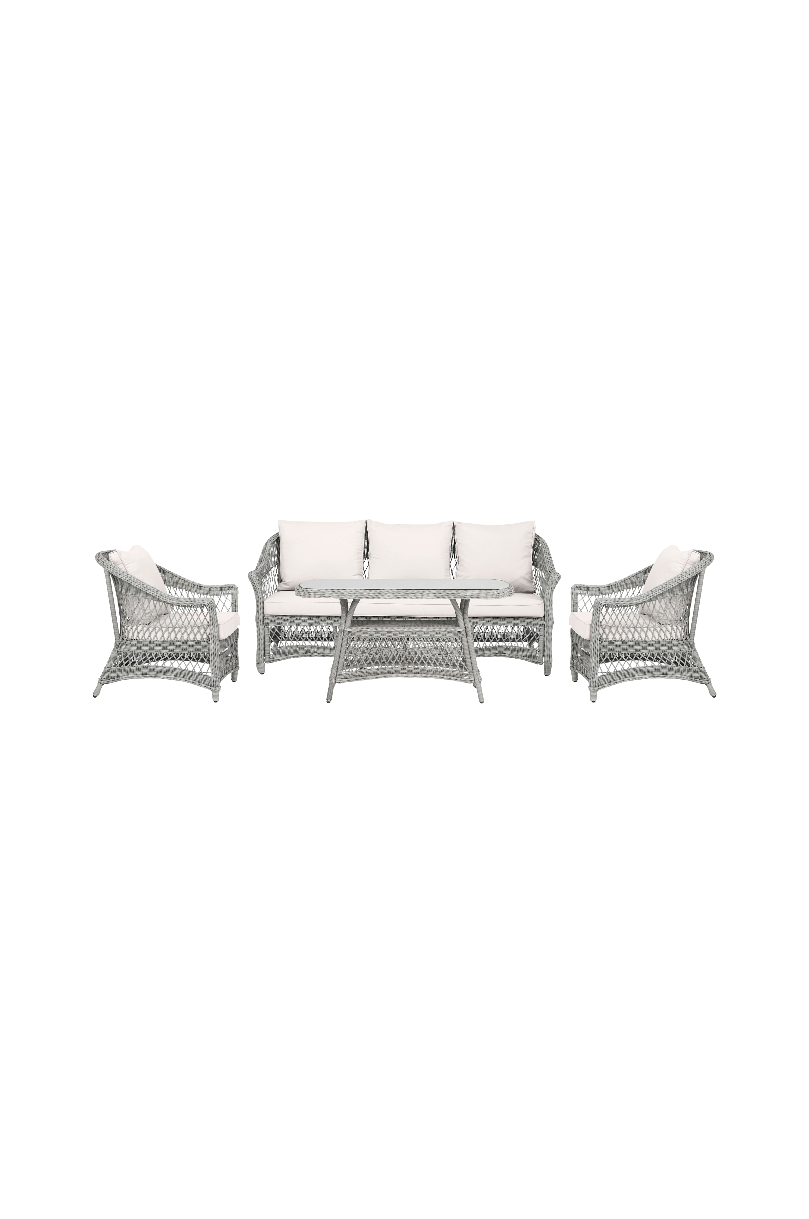 Förvandla din utomhusoas med vårt eleganta möbelset! Soffan, b183xd80xh84cm, har en generös 164cm bred sits, prydd med en plyschdyna i 10cm tjock polyester. Stolen, b78xd80xh84cm, har en bekväm 59 cm bred sits, lika stoppad för avkoppling. Bordet, l130xw70xh65cm, toppat med 5 mm tjockt glas, ger en sofistikerad touch. Denna ensemble är tillverkad av slitstarkt 230 g/m2 polyestertyg och kombinerar elegans med tålighet. Med en maximal viktkapacitet på 240 kg för soffan och 120 kg för stolen kan du förhöja din utomhusupplevelse med den perfekta blandningen av komfort, stil och styrka!